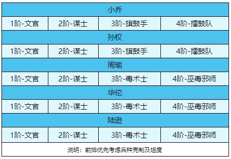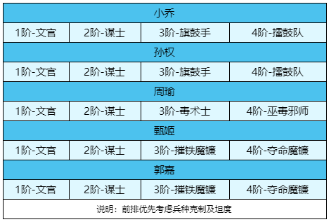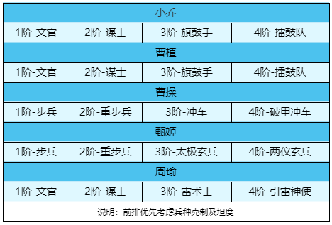 兵种选择方面,周瑜前排可以考虑克制骑兵的3阶入门修士(4阶高阶修士),曹操推荐冲车,甄姬推荐策攻高的步兵,小乔曹植旗鼓手!