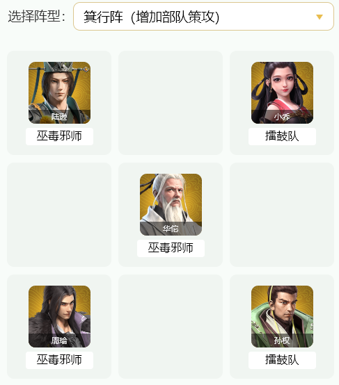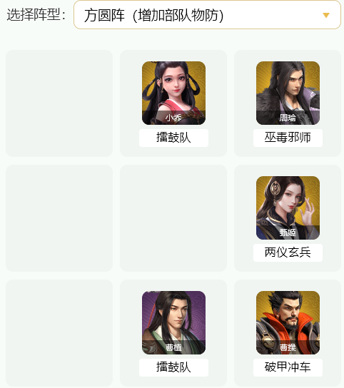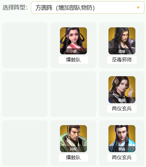 辅助鼓手选择上,小乔提供连续士气,孙权可增加计策攻击和三防(计策防御,物理防御,战法防御),让阵容整体输出和防御都得到加强。