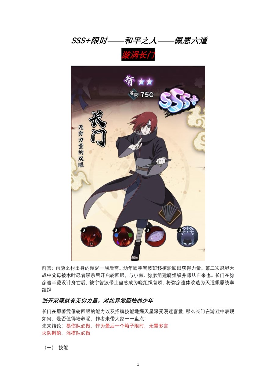 前言:雨隐之村出身的漩涡一族后裔。幼年因宇智波斑移植轮回眼获得力量。第二次忍界大战中父母被木叶忍者误杀后开启轮回眼,与小南、弥彦组建晓组织并师从自来也。长门在弥彦遭半藏设计身亡后,被宇智波带土蛊惑成为晓组织首领,将弥彦遗体改造为天道佩恩统率组织。下面就来看看吧。