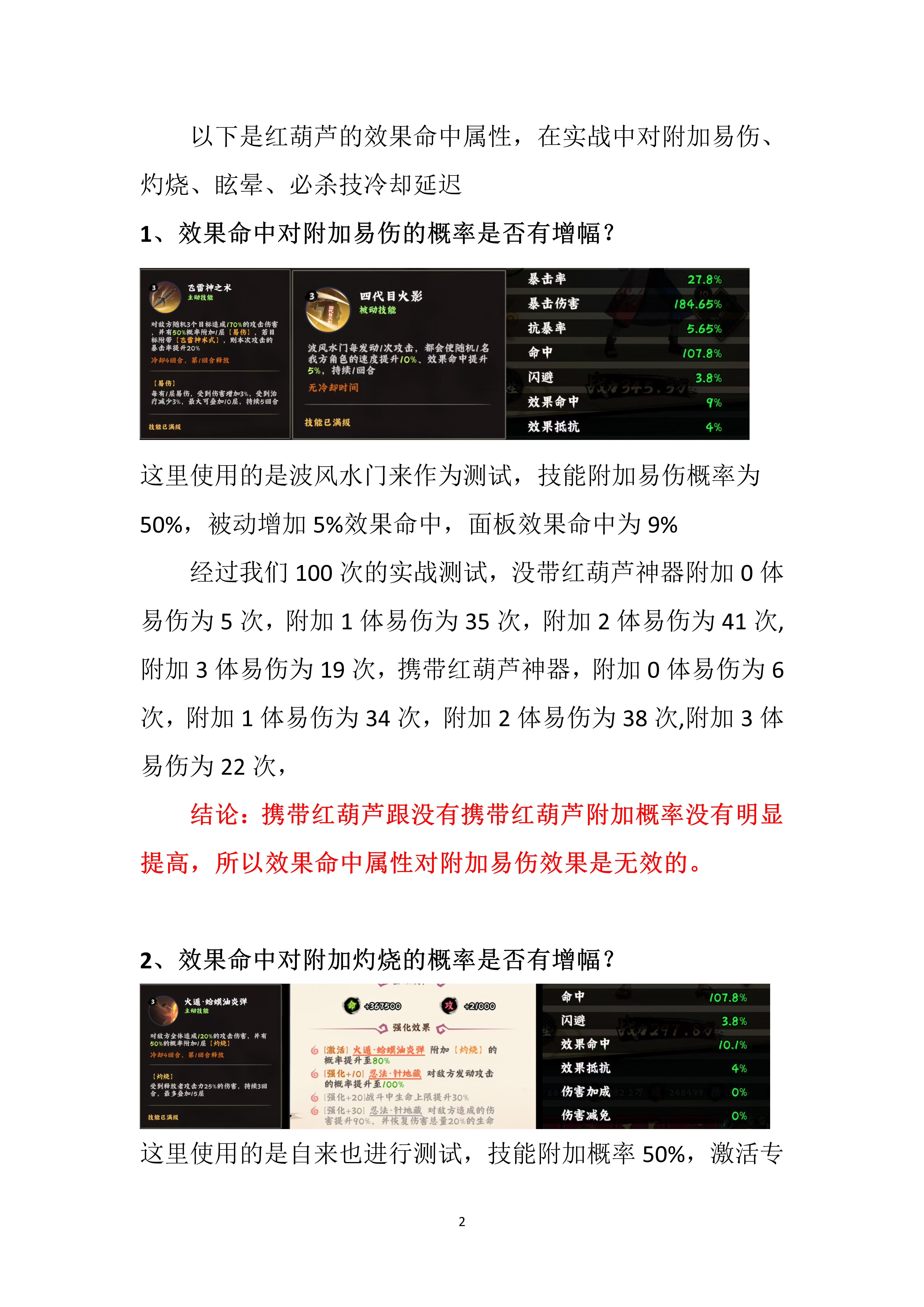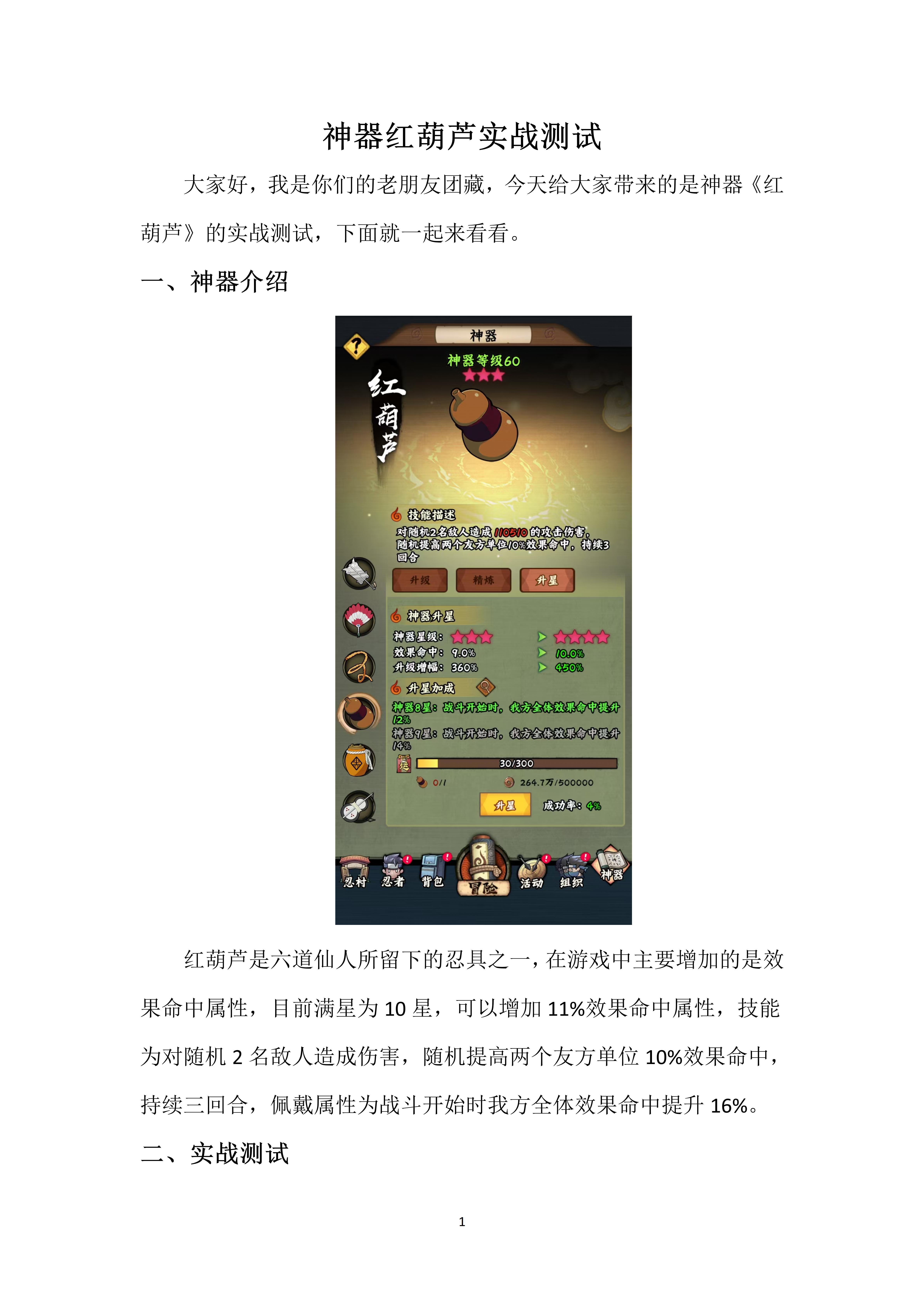 红葫芦是六道仙人所留下的忍具之一,在游戏中主要增加的是效果命中属性,目前满星为10星,可以增加11%效果命中属性,技能为对随机2名敌人造成伤害,随机提高两个友方单位10%效果命中,持续三回合,佩戴属性为战斗开始时我方全体效果命中提升16%。