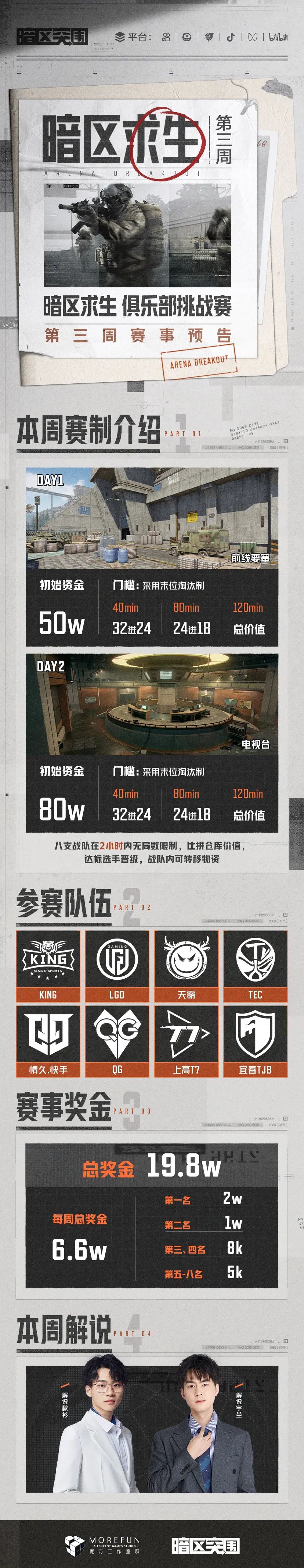 本周求生挑战赛的地图同样有所变化,难度也会相应有所提升。职业选手们将在前线要塞和电视台决出最终的求生冠军。相信他们在激烈争夺冠军宝座的同时也会给电视台的玩家带来一些职业选手的小震撼。那么刚刚适应比赛环境的他们在这场终局之战中心态又会发生怎样的变化呢?风雨欲来,让我们把悬念留到今晚,先来预热一下本周赛程吧!