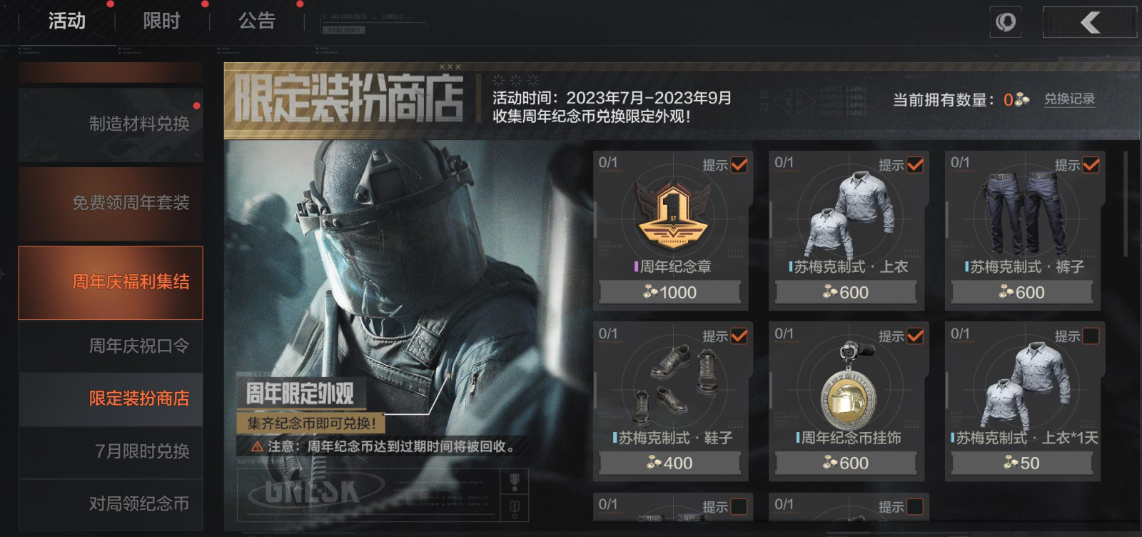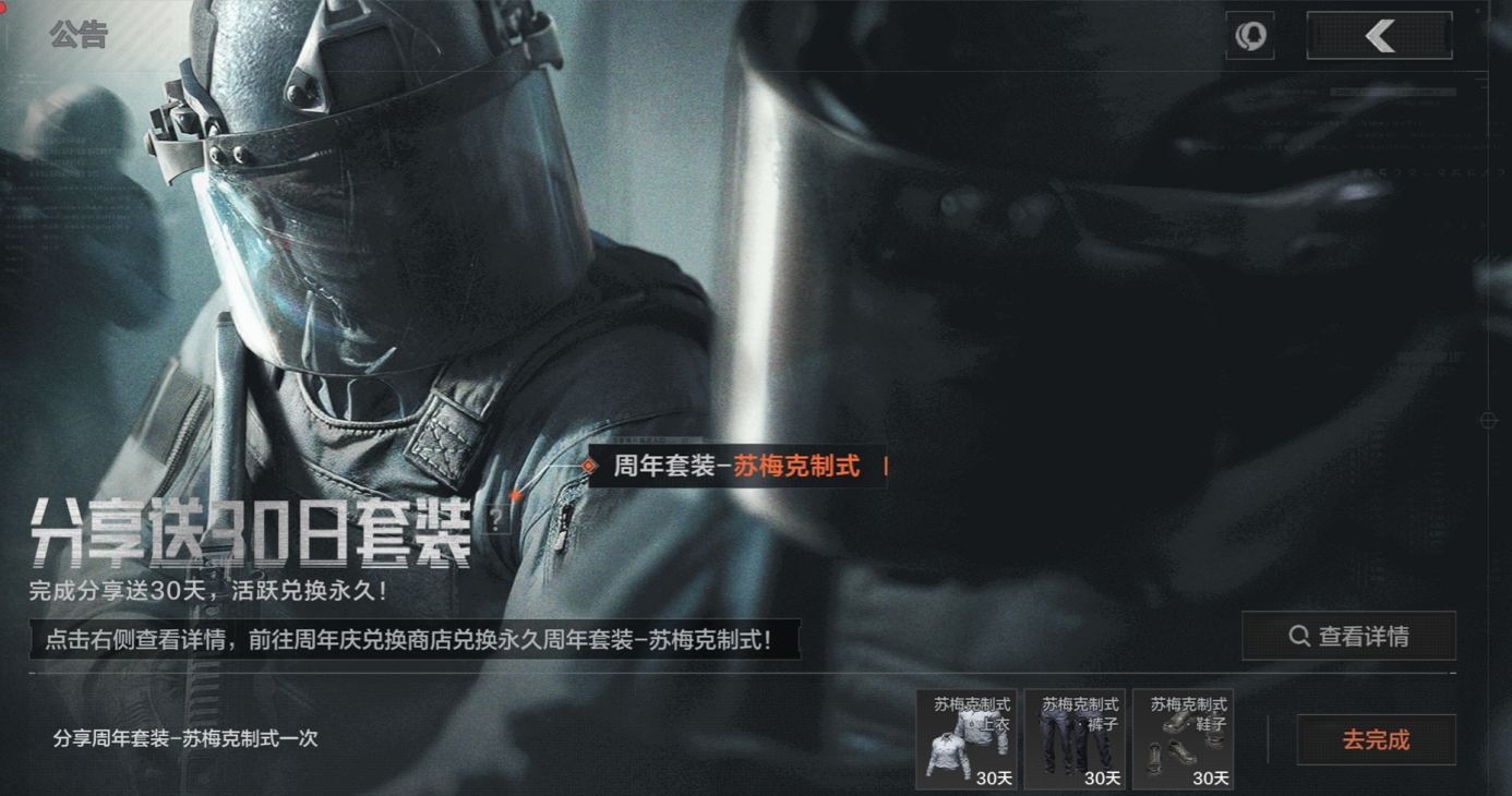 为迎接暗区周年庆到来,将开放周年庆商店,给兄弟们送来更多福利!完成分享将有机会获得周年庆套装(30日),通过完成活动任务收集到更多的纪念币,除了丰富的物资供先锋们进行兑换外,还有机会免费获得不限时周年庆外观套装!