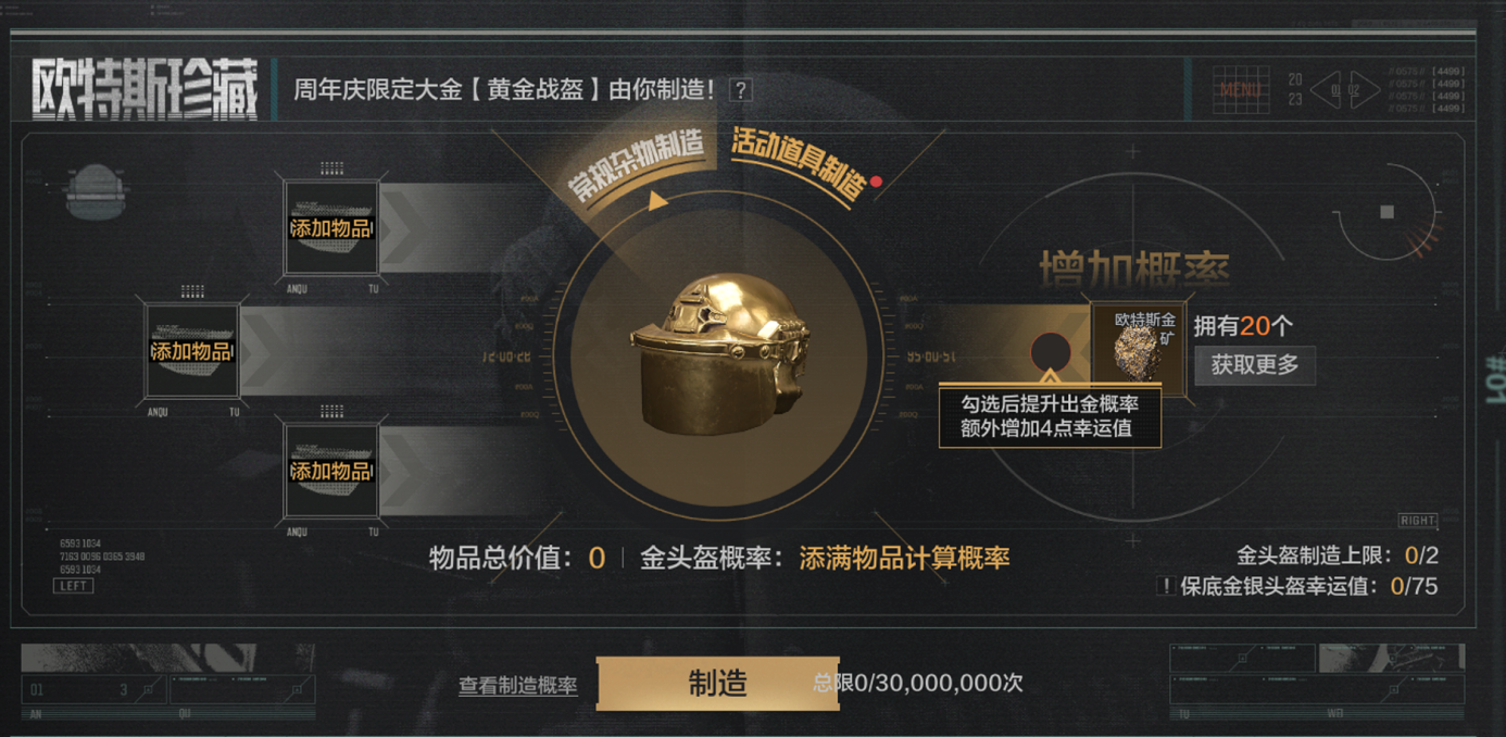 暗区周年庆又一福利:大金自己造!不用进入对局辛苦搜寻,只要你有材料,集齐后就可以直接打造!将有概率打造出属于自己的金头盔!周年庆限定大金将在新赛季中推出,给先锋们带来重磅惊喜,快来试试看能不能打出自己的金头盔吧!