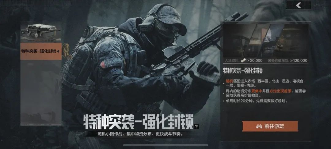 活动期间,入场消耗20000柯恩币;带入装备价值不低于120000柯恩币,可随机匹配进入农场-西半区、北山-酒店、电视台-一层、前线要塞-内部四张小图中的一张地图。局内物资分布更集中且必定出现首领。