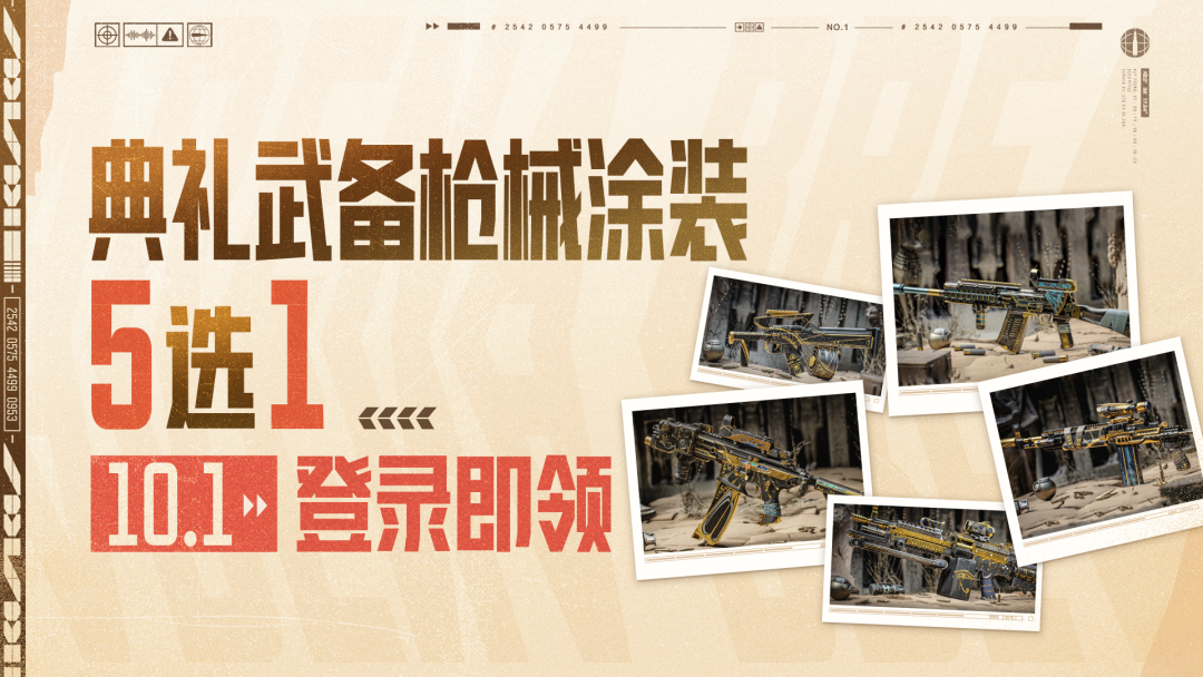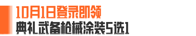 10月1日登录即可领取典礼武备枪械涂装,五款枪械涂装任选其一!仅限10月1日当天,千万别错过!