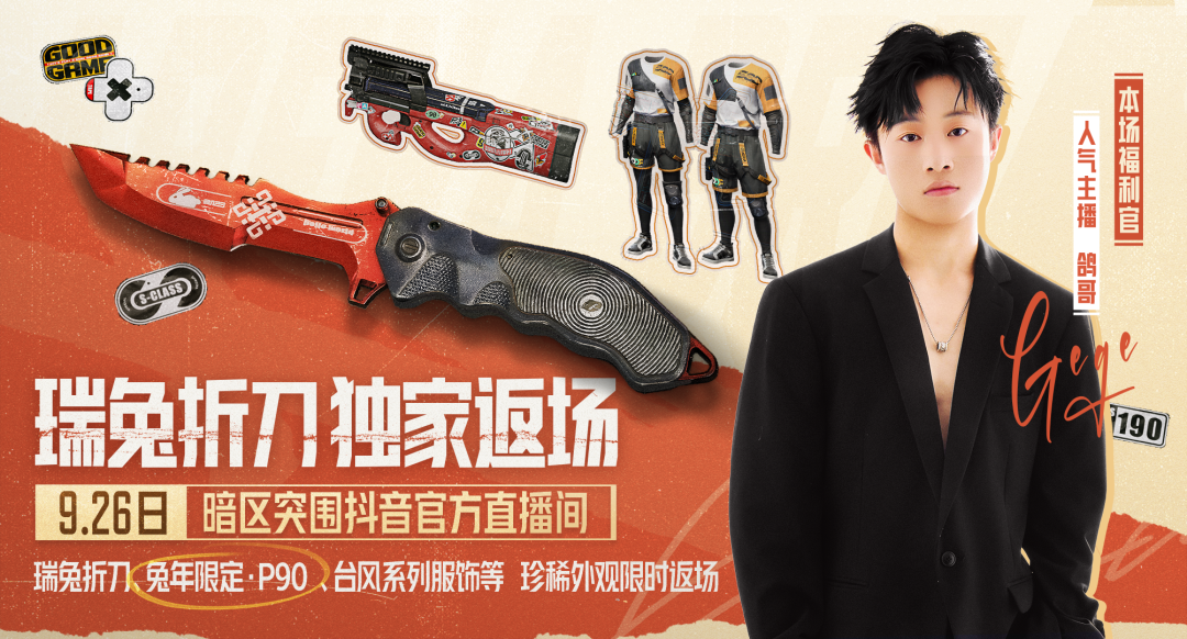 瑞兔折刀独家返场!9月26日锁定暗区突围抖音官方直播间,特邀暗区人气主播鸽哥为本场福利官。