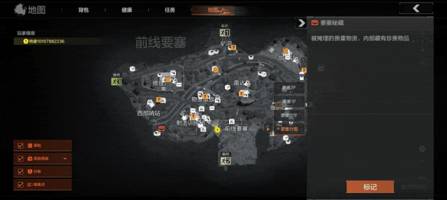 在【前线要塞-沙暴过境】模式中,可在保险箱内搜索获得秘藏情报道具,当小队成员共同拥有一定数量秘藏情报后可解锁要塞秘藏。解锁后可在地图查看要塞秘藏的位置,至少有一个要塞秘藏包含大金!