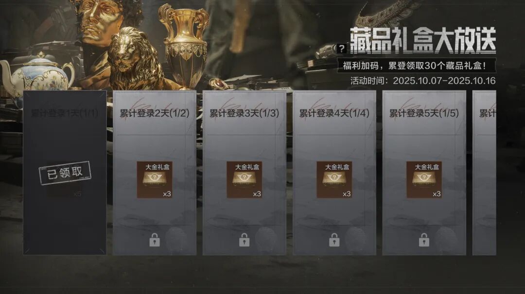 活动期间每日登录游戏即可领取藏品礼盒,累计登录7天可得总计30个藏品礼盒!打开藏品礼盒可获得一件随机物品,最高可获得机密文件!