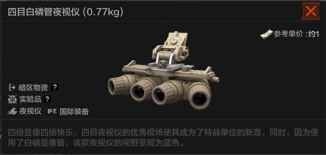 四倍显像四倍快乐,四目夜视仪的优秀视场使其成为了特战单位的新宠,同时,因为使用了白磷显像管,该款夜视仪的视野呈现为蓝色。