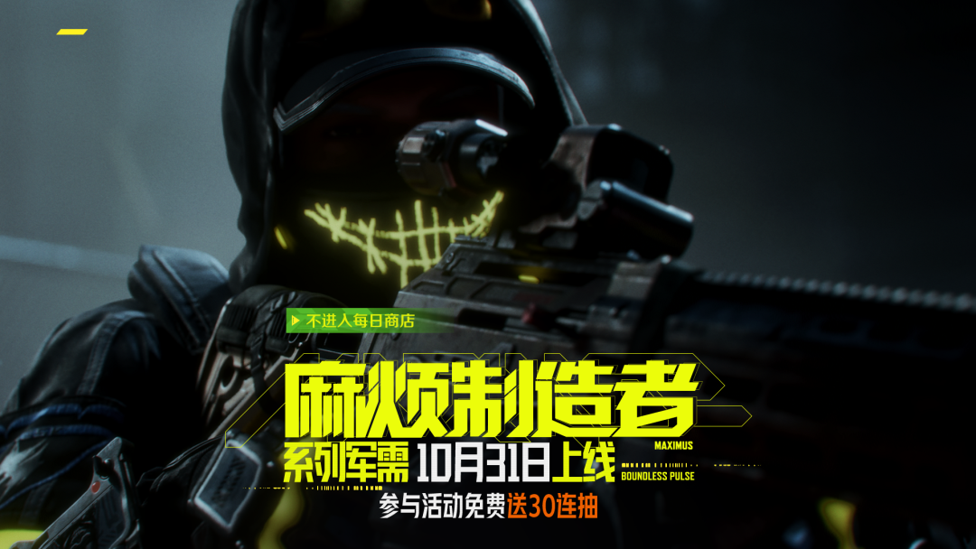 【麻烦制造者】军需活动10月31日即将上线,角色外观【脉冲·马克西姆】、全新近战武器【空腔战术】、金色枪械涂装【战术大师·AEK】&【战术大师·AN94】等全新军需。