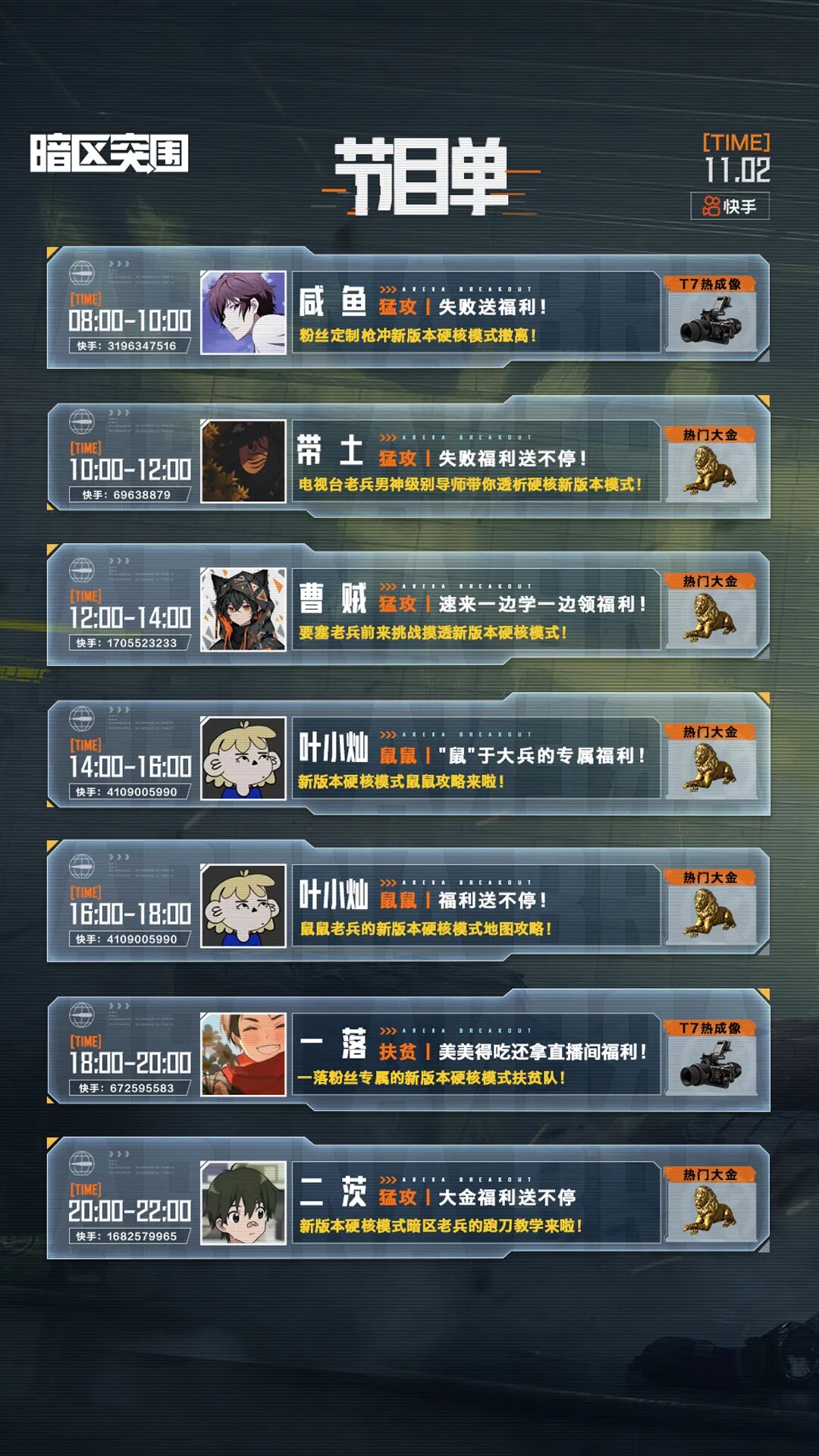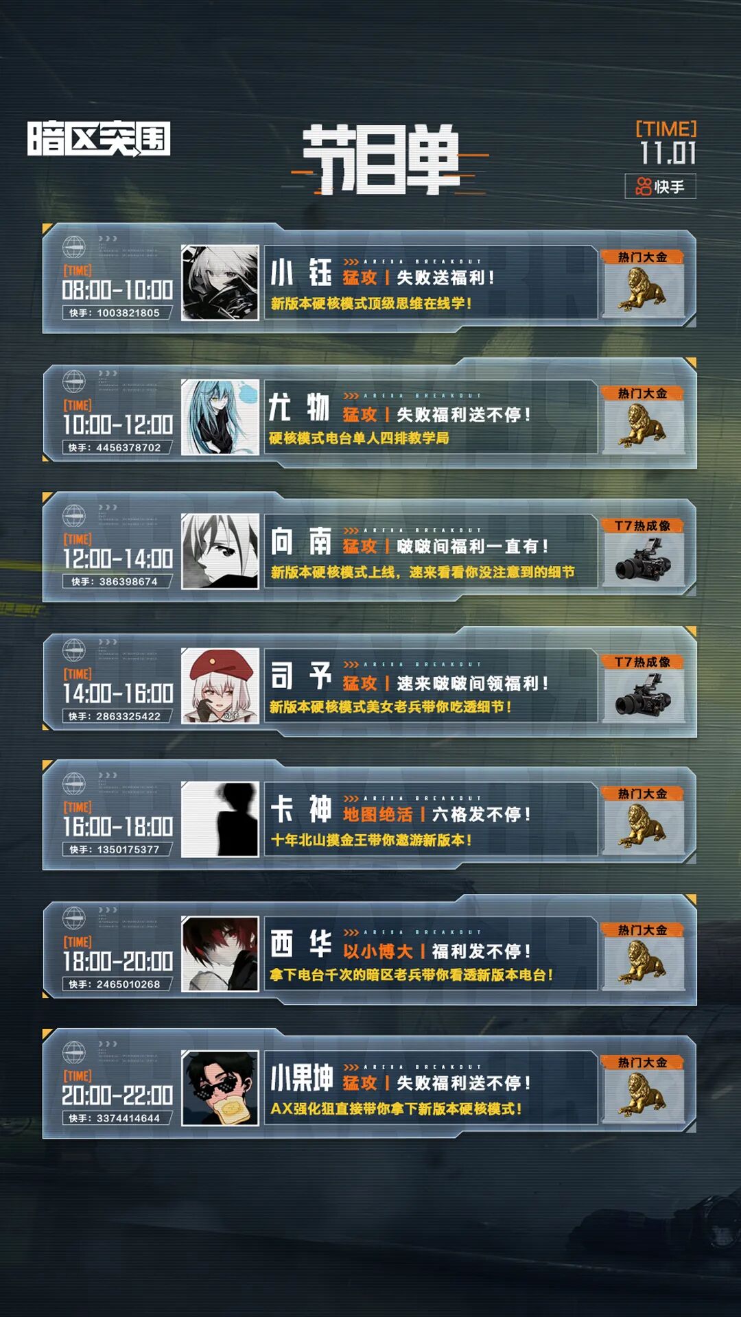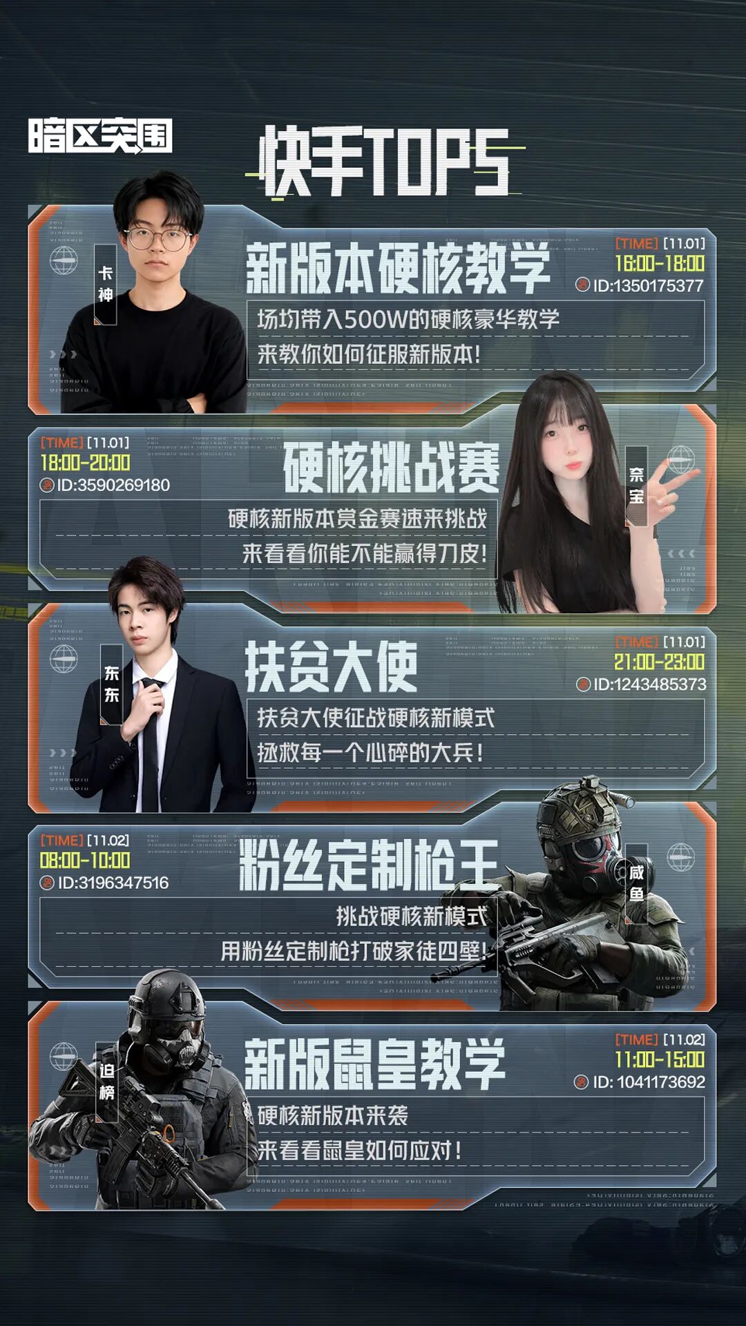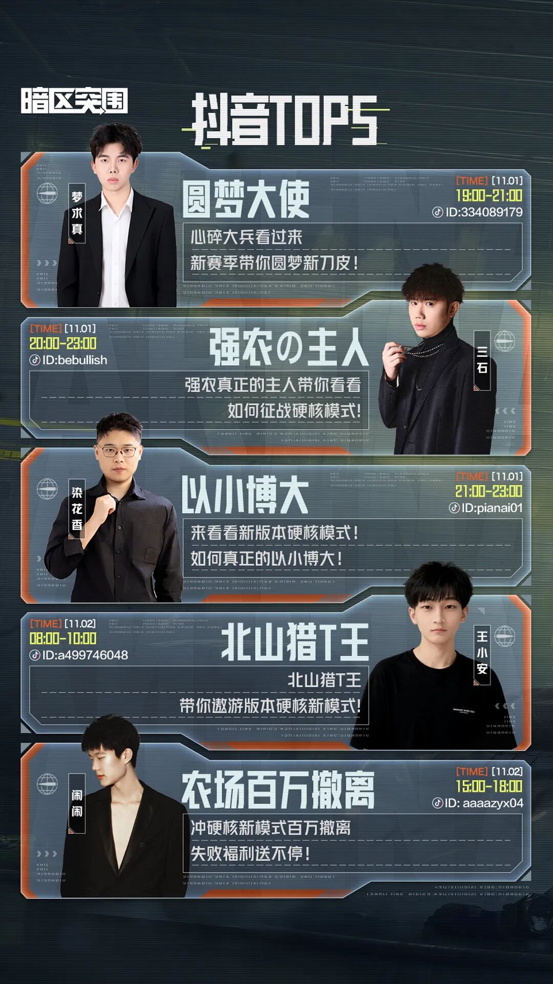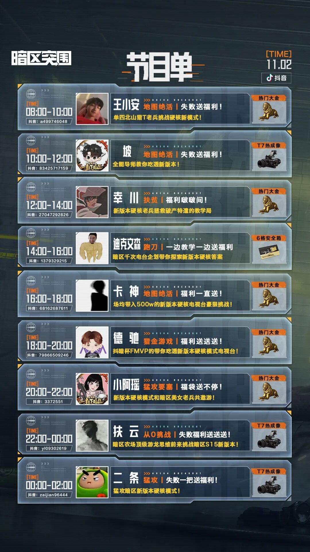 11月1日-11月2日,这个周末各大主播各展身手,全是绝活,用顶级理解教你新版本如何肥肥撤离!锁定直播间,机密文件、理想国、大金等宠粉福利随机掉落不停~