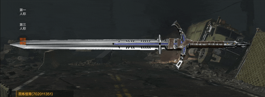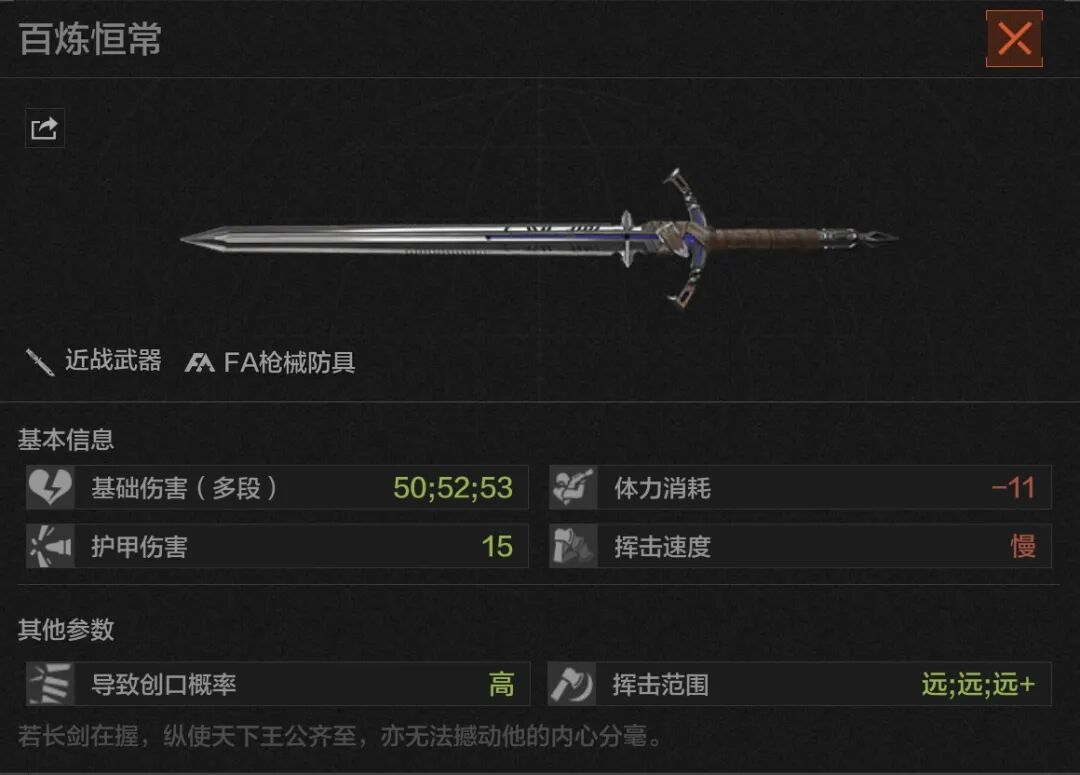 长剑名为【百炼恒常】。剑身修长笔直,通体闪耀着耀眼的银光,一道湛蓝烙印其间。牛皮紧缠的剑柄,无声诉说岁月痕迹。如今它静默伫立,等待着你的掌控。