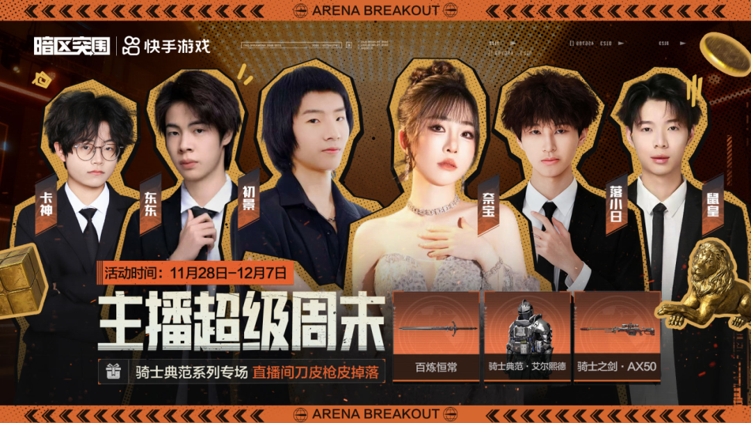 11月28日-12月7日,15位暗区人气主播,精彩直播不间断!更有全新【辉尘溯光】主题军需随机掉落!锁定你的爱播,准时开冲!