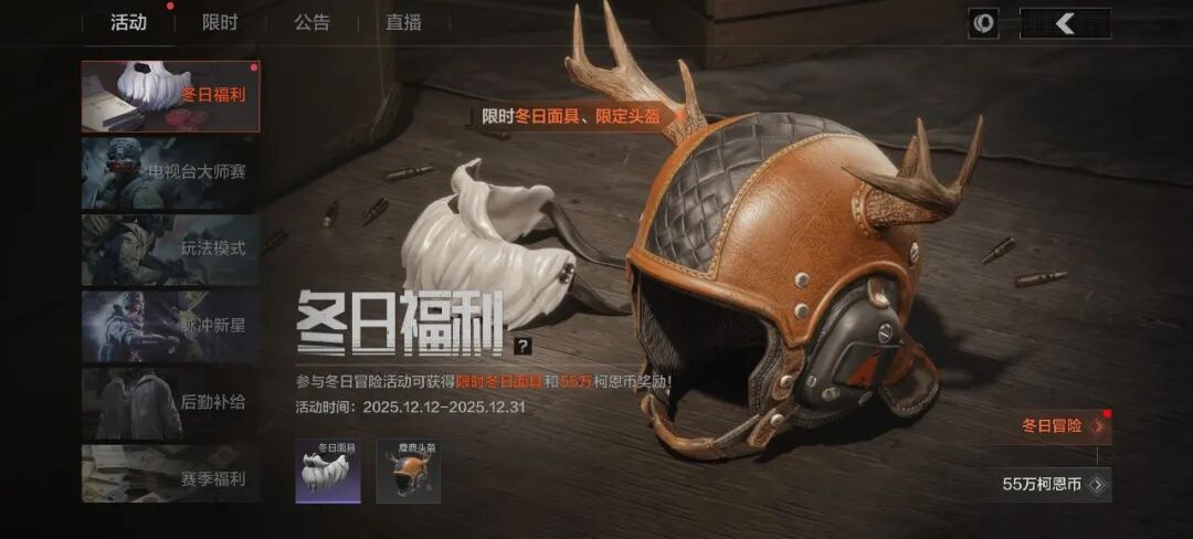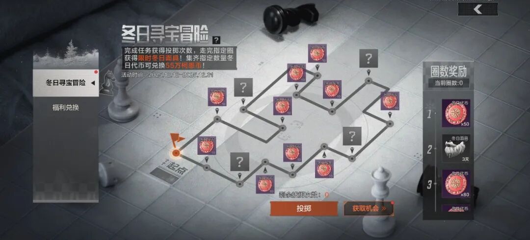 完成任务获得投掷次数,消耗投掷次数参与冬日寻宝冒险即可获得冬日代币。消耗代币可以兑换最高55万柯恩币!累计完成指定圈数还能额外获得冬日代币、限时冬日面具、装备-麋鹿头盔奖励!(装备-麋鹿头盔通过活动仅可获得一个)