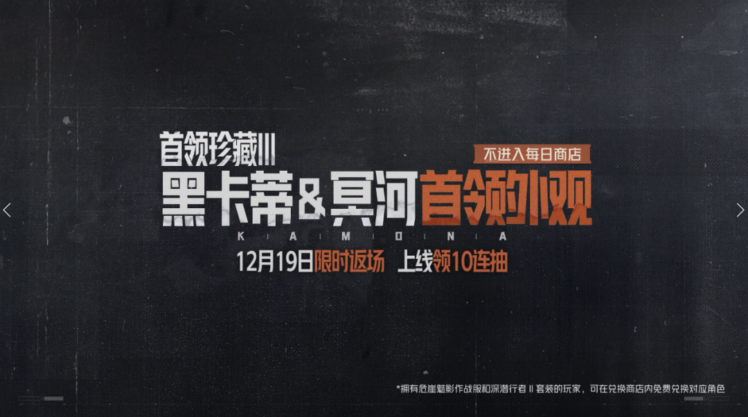 【首领珍藏III】主题军需活动12月19日即将开启!黑卡蒂、冥河、下弦月、急袭弯刀返场,上线领免费十连抽!