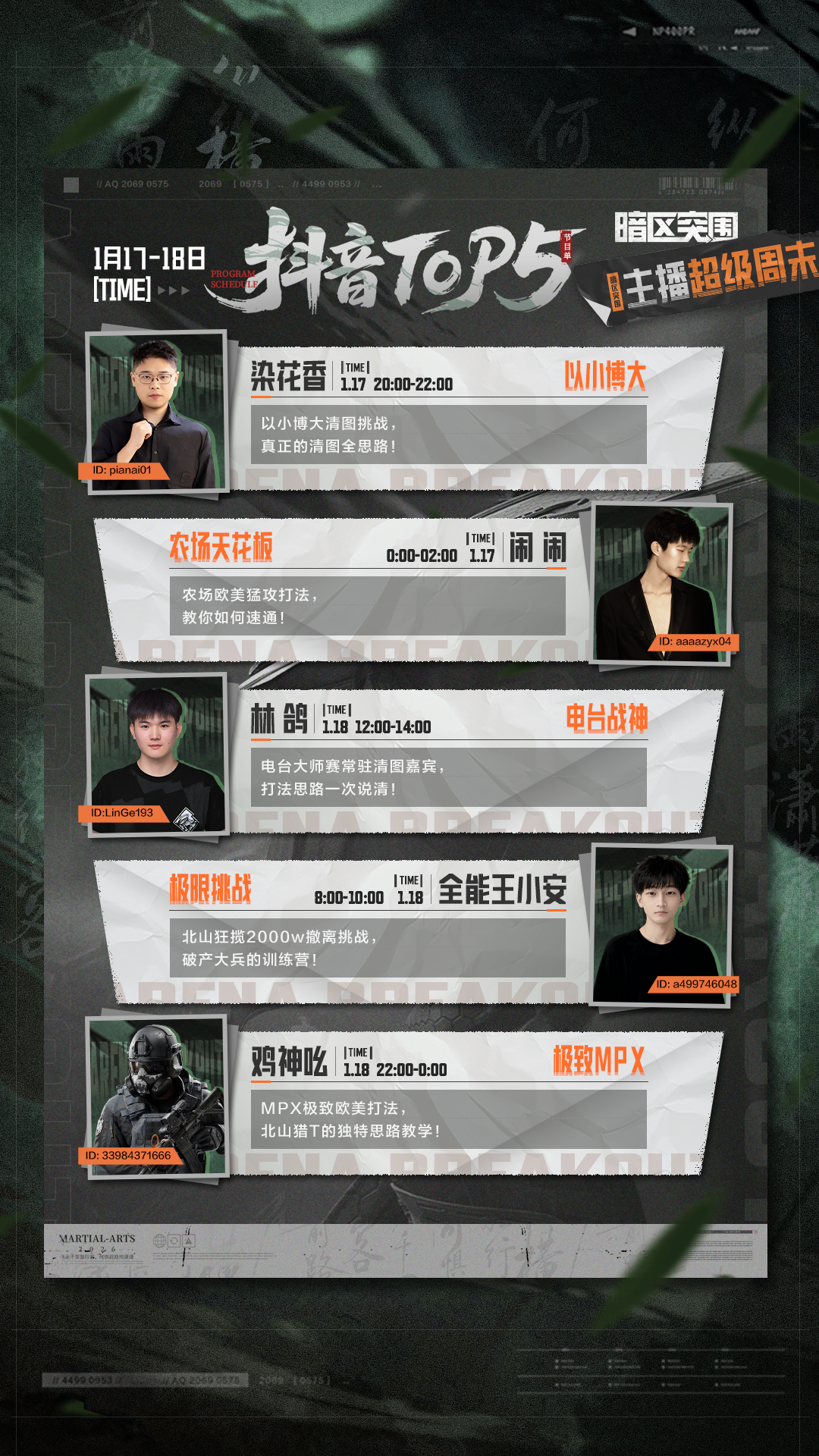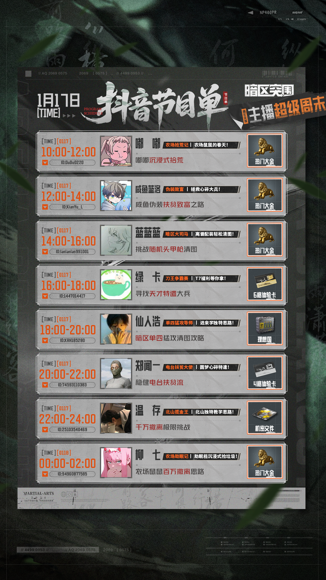S16「宿命之战」火力拉满!农场鼠鼠党集体 “出道”—— 嘟嘟、柳七沉浸式拾荒,教你“捡垃圾”也能百万撤离;更有刀王争霸、单四猛攻、北山揽金王等高燃局,蓝蓝蓝、仙人浩、温存秀翻操作!从农场到北山,从鼠鼠到猛攻,多位主播各显神通!