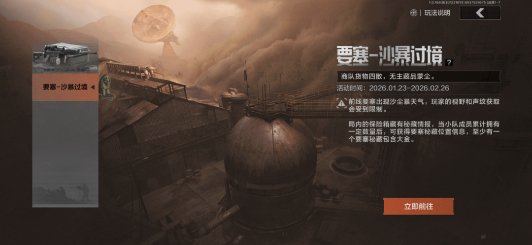 活动期间,限时开启【要塞-沙暴过境】,入场需消耗45000柯恩币,身上装备总价≥160000柯恩币。局内必定出现沙尘暴天气,可视区域和声纹获取会受限。