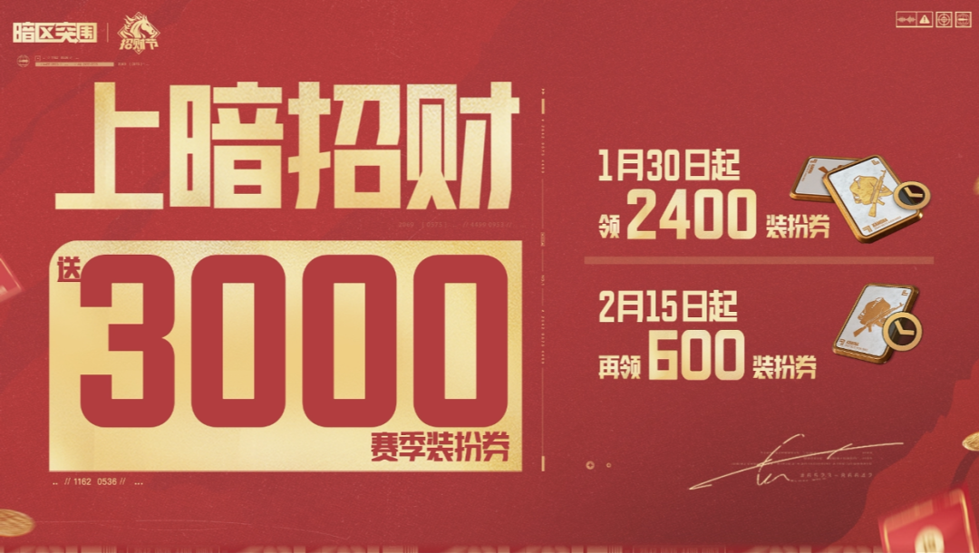 总计3000赛季装扮券!1月30日起,参与活动可领2400赛季装扮券;2月15日起,登录即领600赛季装扮券!