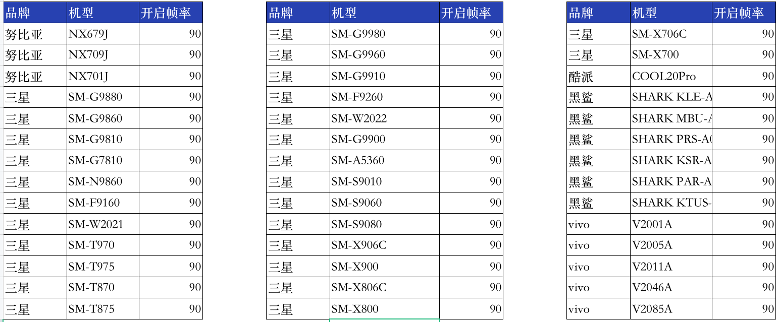 高帧率高刷新率是近两年手机的发展方向之一,硬件设备更新了,游戏端自然也要跟着更新,新版本新增了一大批高帧率机型:魅族18s、索尼Xperia 5 III、荣耀TNA-AN00、荣耀TNA-TN00等机型,具体适配可以看下图,表中填写的都为设备号,而非大家平时称呼的手机型号。