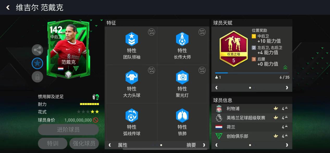 数据方面,这张范戴克给到了142的总评,在天赋的加持下,700的双速并不算很慢,704的防守数据,让范戴克的防守能力十分强悍,703的体格数据在对抗中丝毫不落下风。