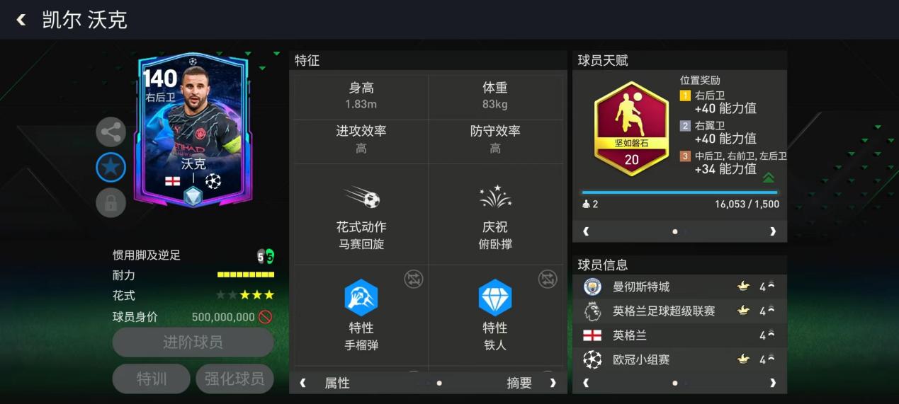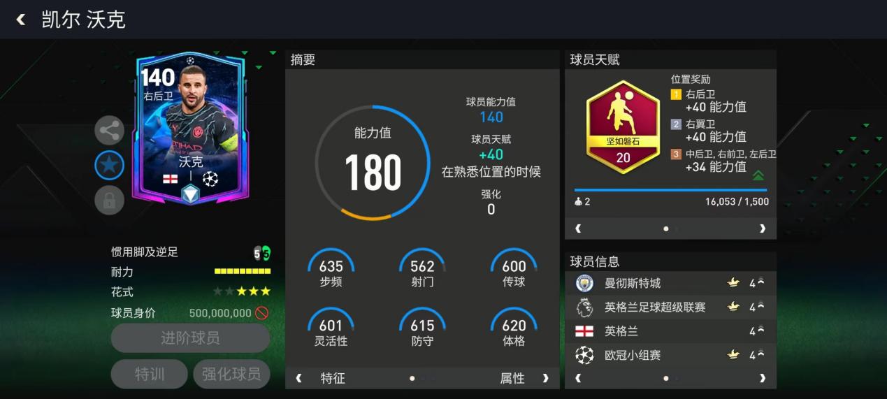 欧冠活动的这张沃克给到了140的基础能力值,入手简单,实用性强,沃克的数据配置在同档位球员中没有对手,综合性价比极高。