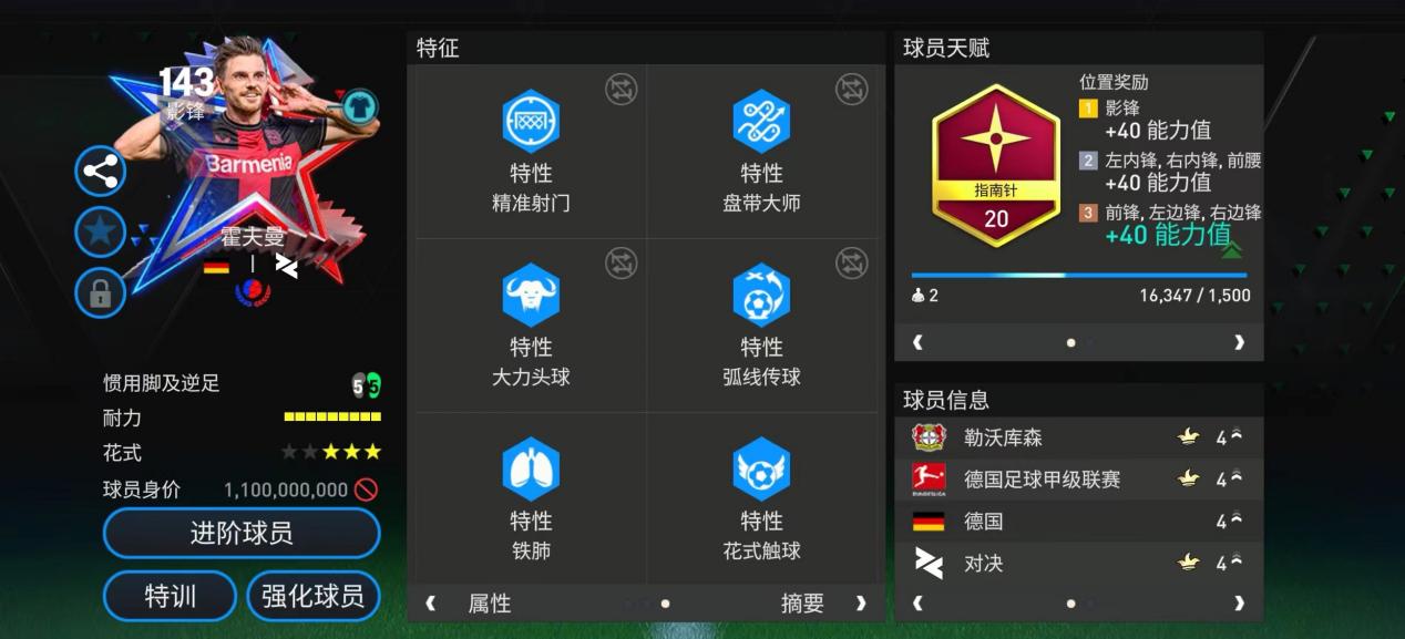 特性方面,霍夫曼配备了八项特性,分别是铁人、反越位大师、精准射门、盘带大师、大力头球、弧线传球、铁肺、花式触球。整体来看,特性配置全面的霍夫曼,实战中的跑位意识、得分稳定性都有提升,铁肺特性也让霍夫曼的耐力消耗速度大大减慢。