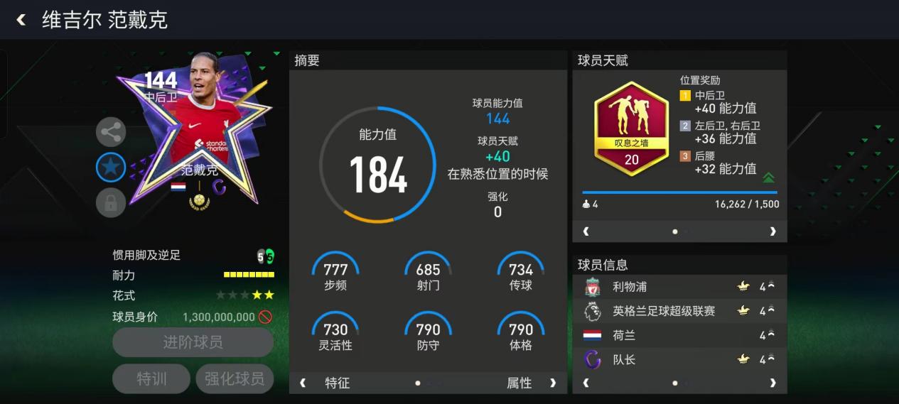 范戴克防守端的数据已经接近800,在实战中大有可为,搭配的叹息之墙天赋强化了他加速、人盯人、铲断、拦截、侵略性,同时还提升了范戴克的力量和平衡数据,这让本就身材高大的范戴克在与对手身体对抗方面更加具有威胁性。