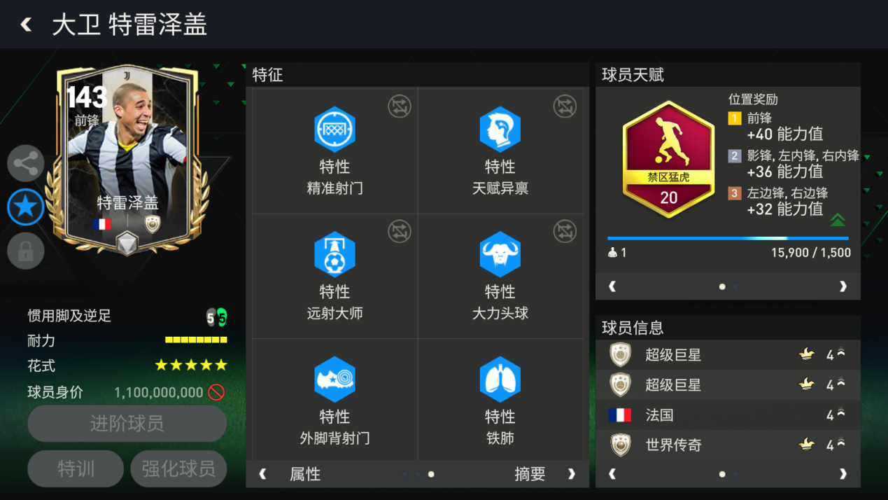 前锋位置,推荐尤文图斯传奇球员143特雷泽盖。盖子在禁区内的头球能力非常不错,强烈推荐给喜欢下底传中的玩家朋友。同时,他在禁区外的远射能力也较为不错。唯一短板就是灵活性一般,不建议过多盘带。