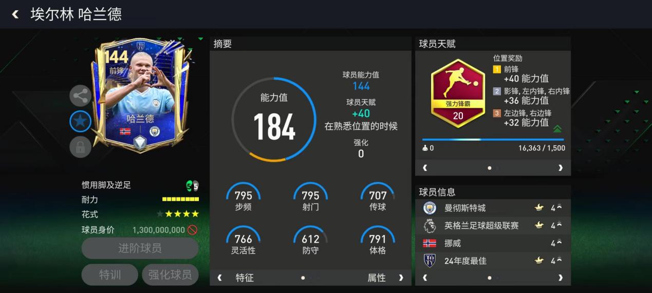 哈兰德在曼市德比中表现低迷,遭遇了不少质疑,本场正是他证明自己的绝佳机会。球迷们希望看到他更多的进球。这张基础能力值144版本的年度最佳哈兰德配备了强力锋霸天赋与四星花式,卡面配置相当华丽,实战表现也非常高能。