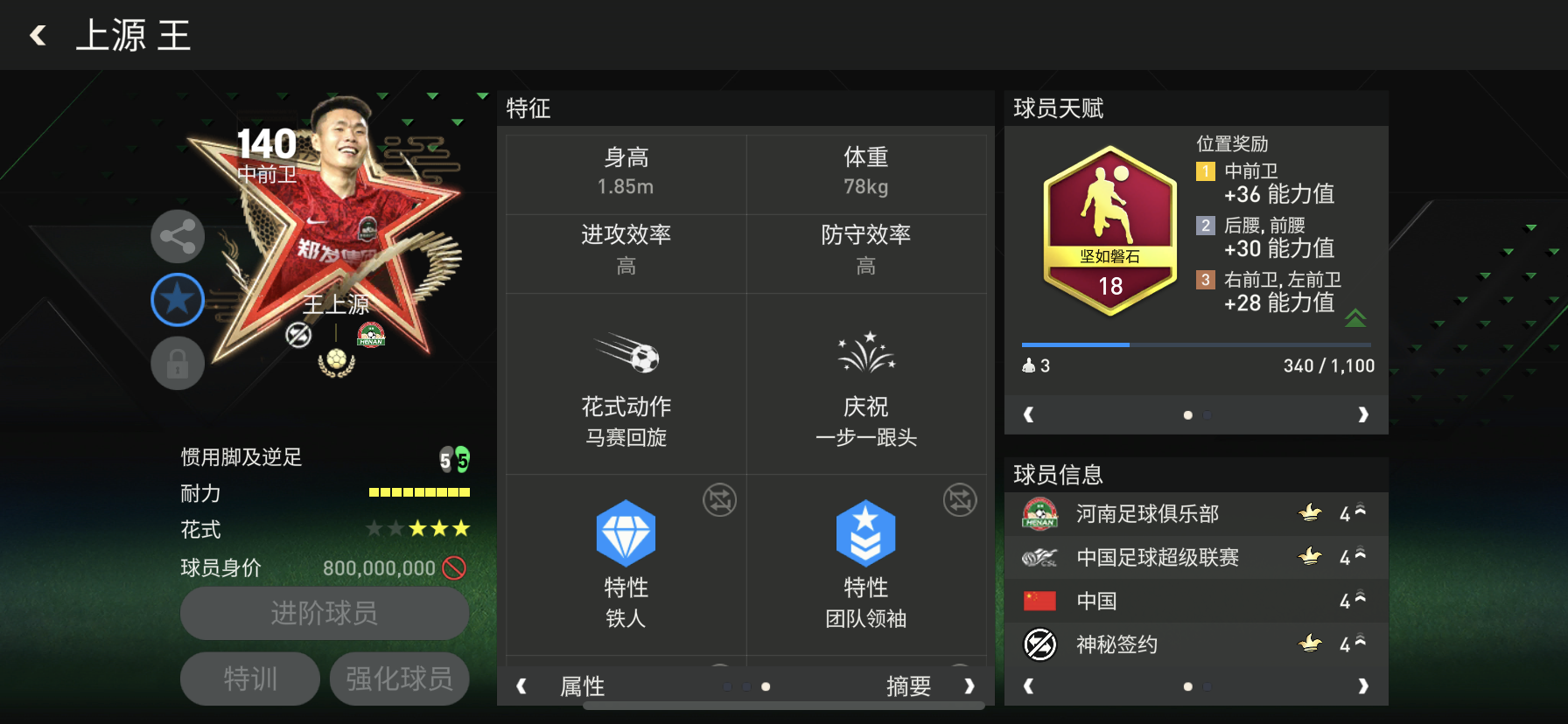 天赋方面,王上源配备了偏防守型天赋坚如磐石,对他的速度以及人盯人防守都有一定增强。花式方面,马赛回旋搭配三星花式星级的配置让王上源具备了一定的中场盘带能力。特性方面,王上源也是配备了组织者、远射大师、长传大师、盘带大师等多项关键特性。攻守效率方面,王上源同样是双高的配置,进一步增强了他在中场的存在感。
