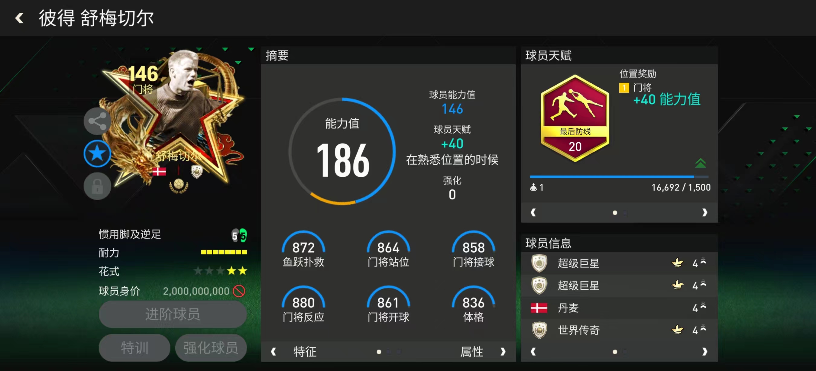 天赋方面,舒梅切尔配备了门将球员专属的最后防线,对他的多项扑救数据有所提升。作为一名门将,舒梅切尔的身材高大,反应极快,实战表现也值得信赖。