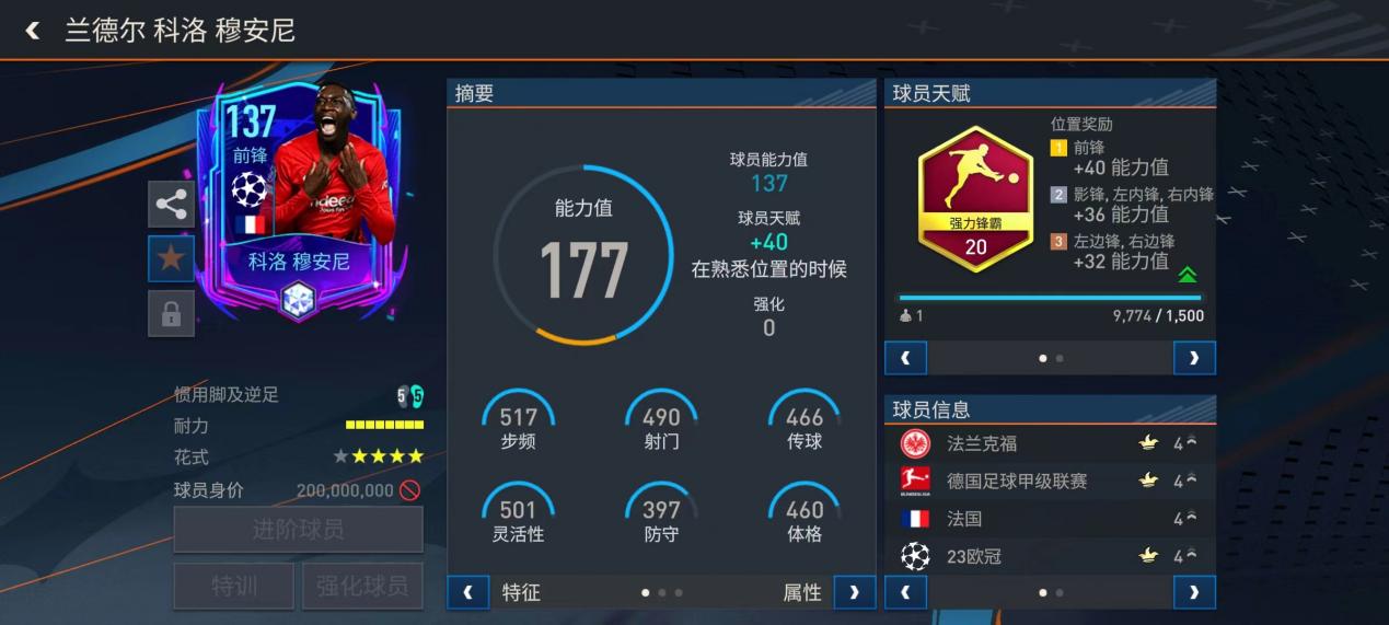 这张欧冠活动球星卡,是穆阿尼的首张半身像卡。卡面配置堪称华丽,各项数据接近一流前锋水准,强力锋霸的天赋配给,也一定程度加强了他的锋线统治力。实战中,穆阿尼的身体素质十分优越,他很善于利用身体为队友拉开空间,他自己也能完成带兵带球突破的好戏。他的射术与冲击力都是游戏中十分顶尖的存在。