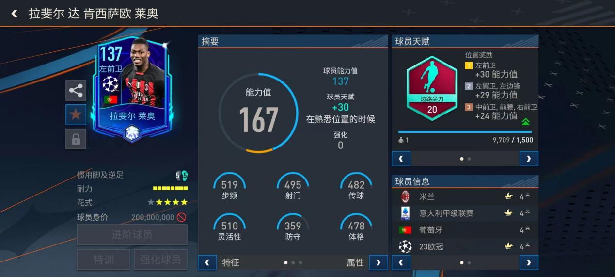 表现不俗的莱奥在游戏中也是十分优秀的边路球员。他的带球过人能力很强,喜欢用变向及步伐调整来晃开对手随后提速过掉对手。他的终结能力不俗,左脚射门精准度极高。他有一脚十分细腻的威胁球传递能力,传中能力与小范围传切配合也十分出色,是很好的门前僚机。无论是在游戏中还是现实足球世界,莱奥都无疑是顶尖的攻击手。