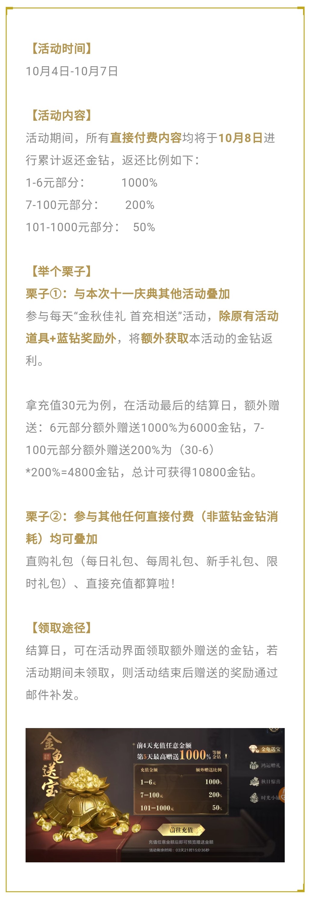 所有直接付费内容(非蓝钻金钻消耗)除了可获取原有的道具、蓝钻、金钻之外,额外可拥有累计返还金钻!