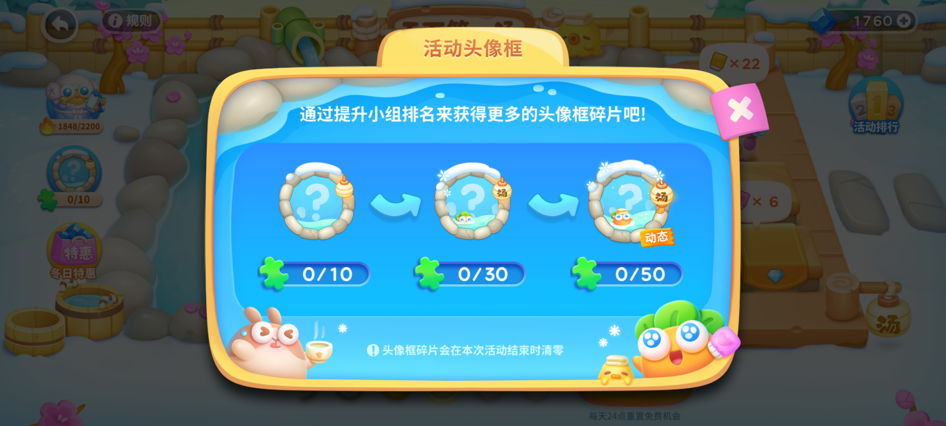 每天挑战关卡后,将进入随机小组。根据当日所获得的【搓澡巾】数量,将在小组内进行排名,每日结算排名发放活动头像框碎片,获得一定数量的头像框碎片可以解锁天下第一汤限定头像框。
