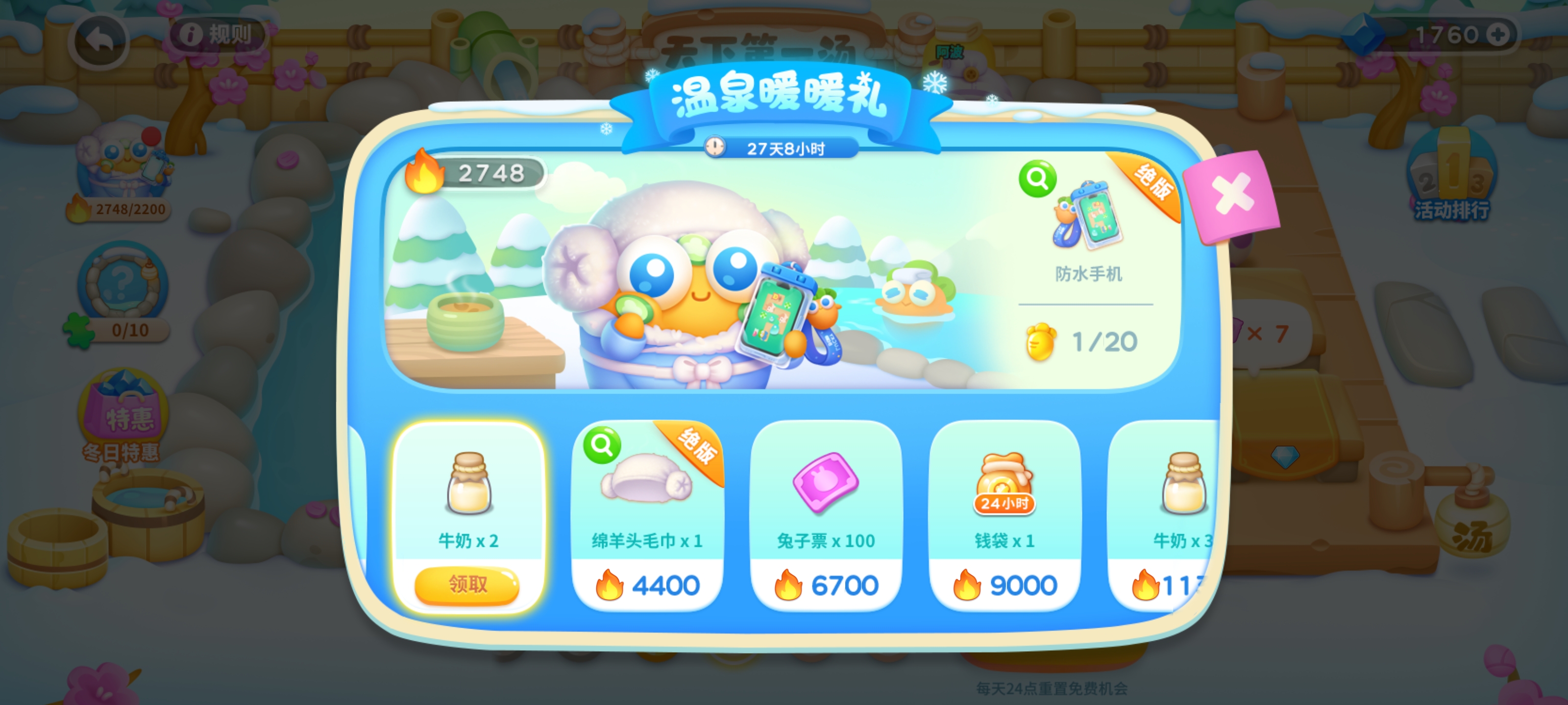 获得一定量的【火力值】,可以在温泉暖暖礼中领取阿波装扮【毛巾帽】、【浴袍】,以及许多呆兔食物、通关道具、兔子票。达成20关固定关卡全金萝卜,将获得阿波手持动态装扮【防水手机】。