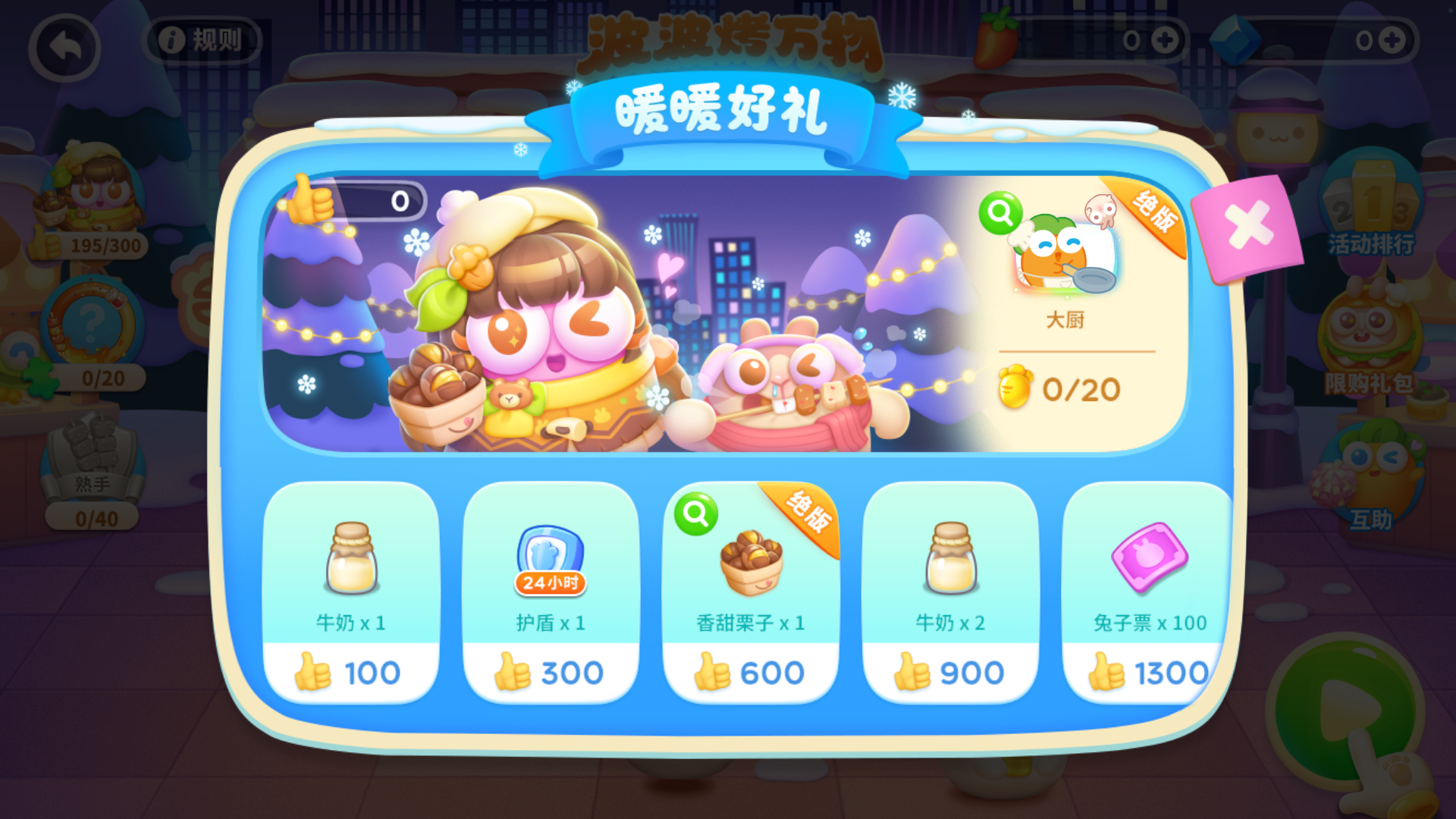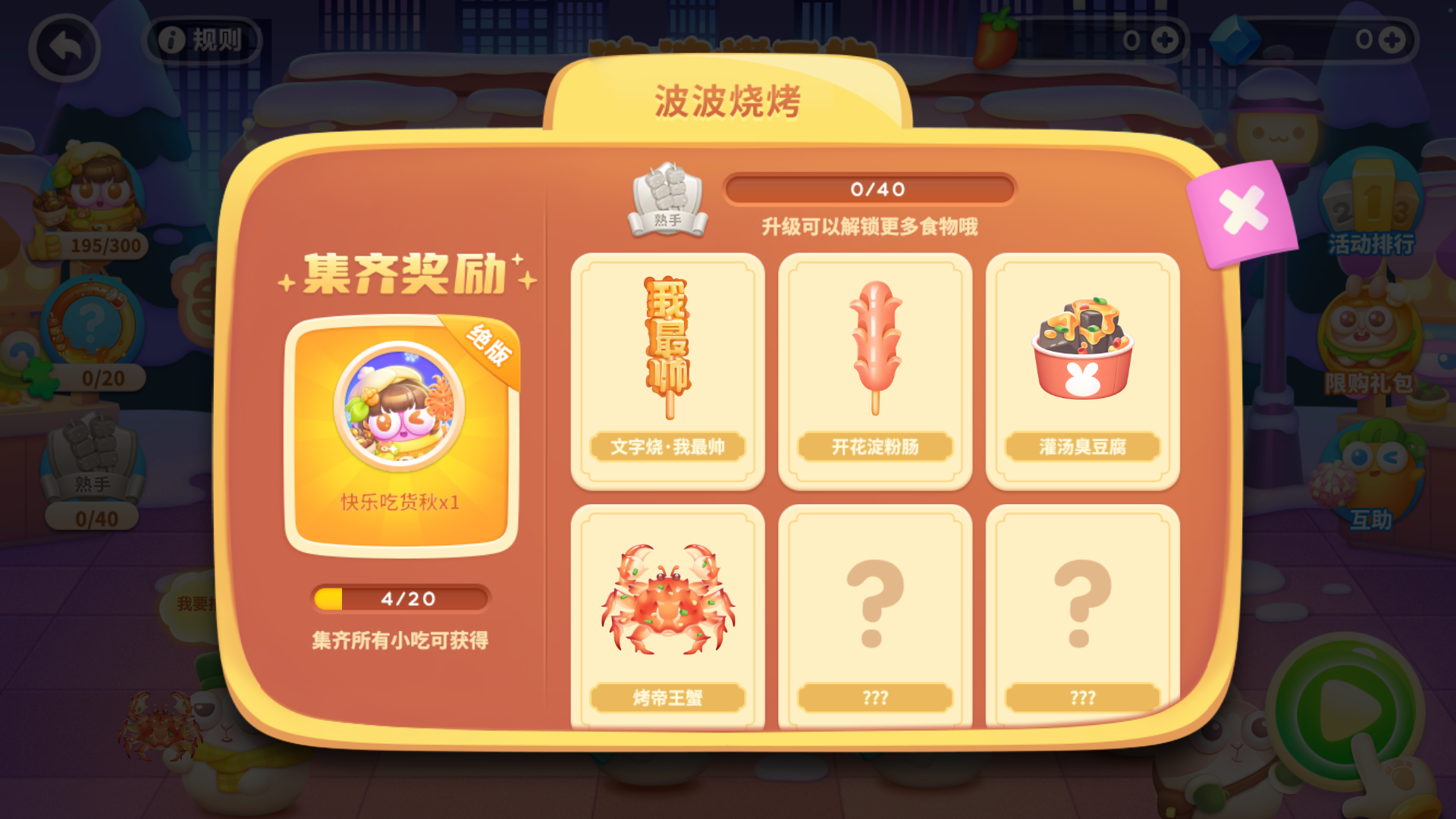 在「波波烤万物」活动中,可以挑战20个固定关卡和1个随机关卡,每天有2次免费挑战机会,免费的挑战次数会在每日24点刷新。挑战活动限定关卡即可获得活动道具「辣椒」,首次通关和首次获得金萝卜即可获得更多噢。