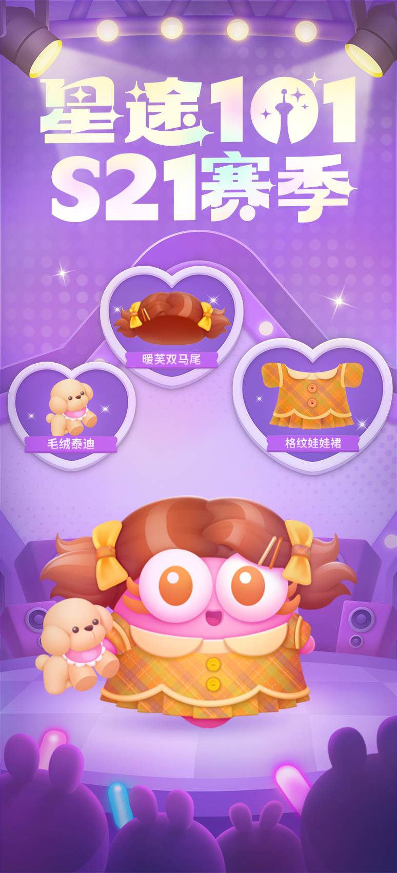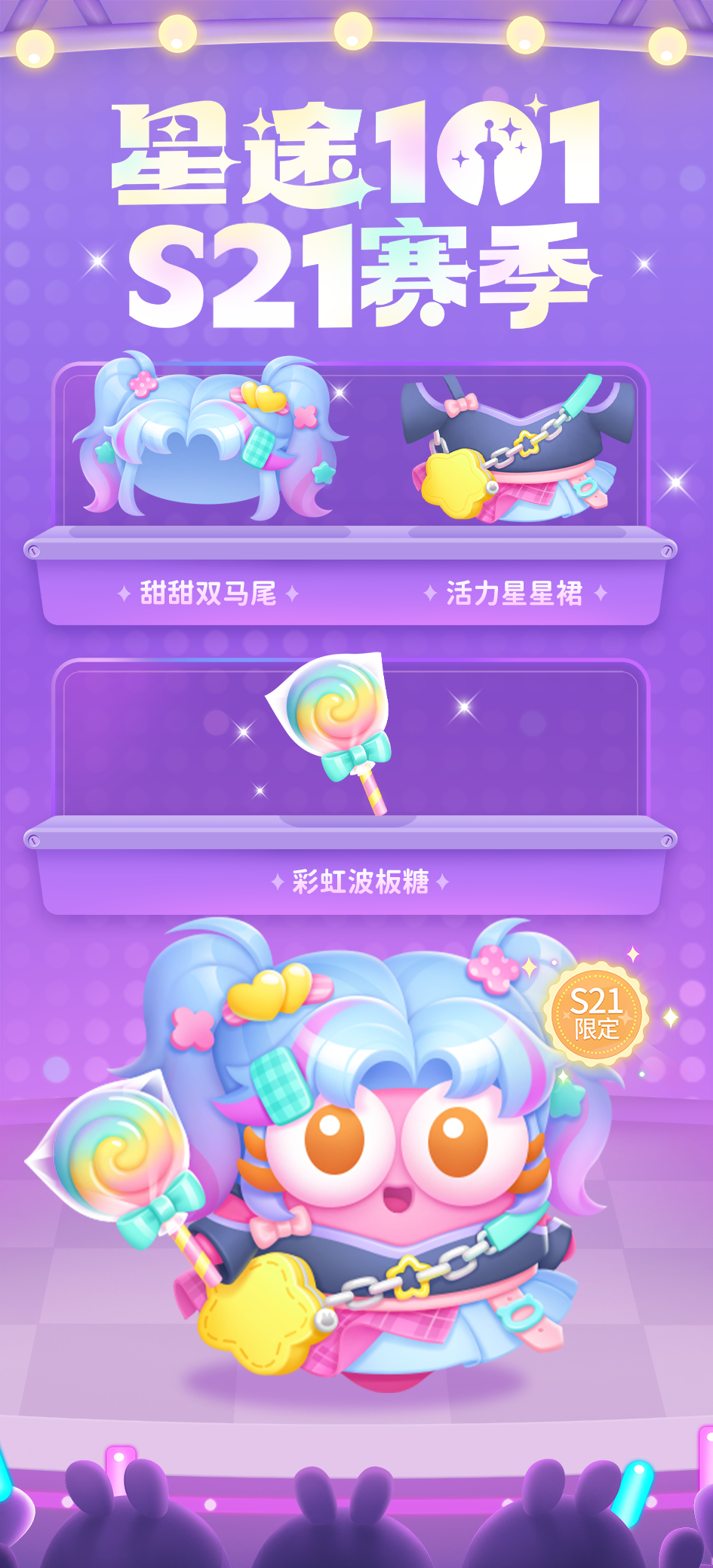 达到星途101指定楼层,就可以把S21赛季限定服饰收入囊中啦。聚光灯下,「甜甜双马尾」在光影间绚烂飞扬,「活力星星裙」的裙摆悦动,谱写着闪亮的梦想,来一口「彩虹波板塘」吧~又活力满满了!梦想就在脚下,一起揭开星光序幕吧~