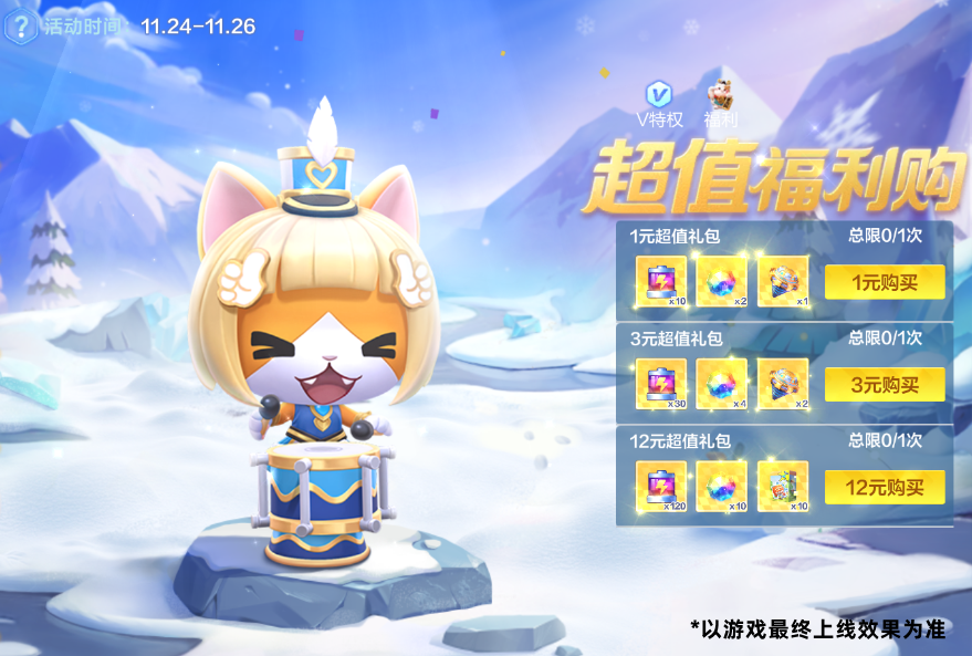11月24日-11月26日,福利站将限时开启【超值福利购】活动,活动期间可直购超值礼包,支付成功后可立即获得不同档位电池、星愿结晶、炽金启动器、宝宝礼物盒等对应礼包奖励。直购金额自动计入V积分,并支持激活招财猫和进宝猫。