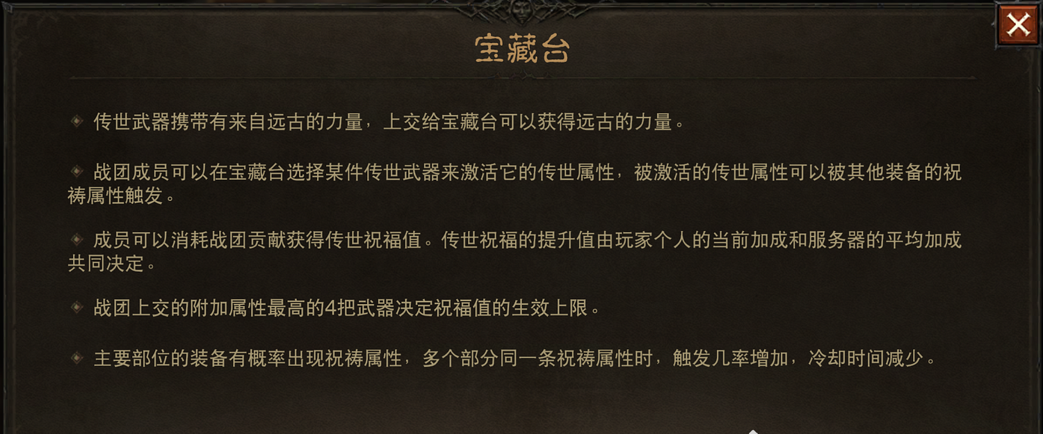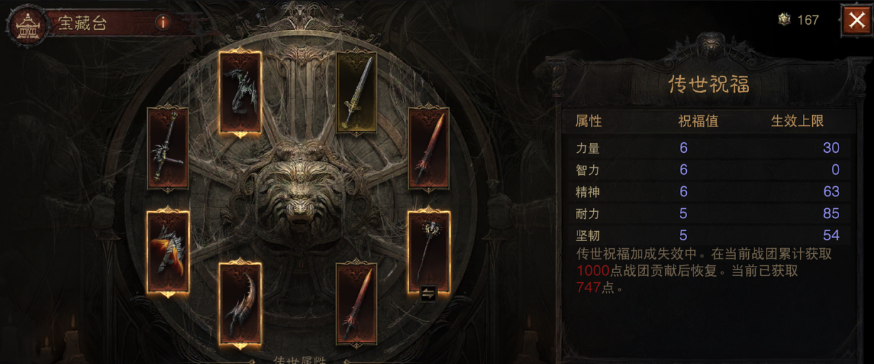 宝藏台还有一个传世祝福的效果,战团成员上交的所有传世武器中,加成属性最高的4把武器决定了祝福值的生效上限,将4把武器的各种加成属性分类相加,再除以4,向下取整,就是生效上限了,祝福值可以增加成员个人战斗等级,受到力量和智力职业,还有生效上限影响,拿我自己是智力职业来举例,力量加的祝福值不能增加我的战斗等级,另外如果生效上限为0,那么这个属性的祝福值也不能增加个人的战斗等级。