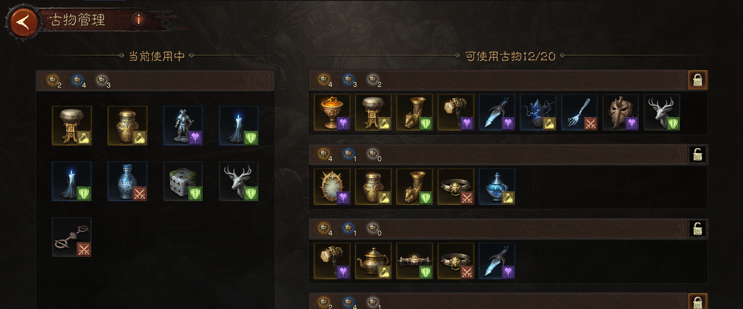 古物分为金色、蓝色、白色三种品质,每种品质都有12个古物,这些古物又平均到四种增益类型,也就是说每种增益类型都有9个古物加成,包含金色、蓝色和白色各3个。