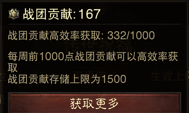 成员可以消耗战团贡献获得传世祝福值,祝福值的提升多少由个人上交的战团贡献和服务器的平均加成共同决定,也就是说祝福值看个人战团贡献,和其他战团成员贡献无关,战团贡献来自于我们每周参与战团魔神挑战、古堡防卫和古堡探索获得,每周前1000点可以正常获取,超过1000点参与活动只有25%收益,每周最多可以获取1500点。