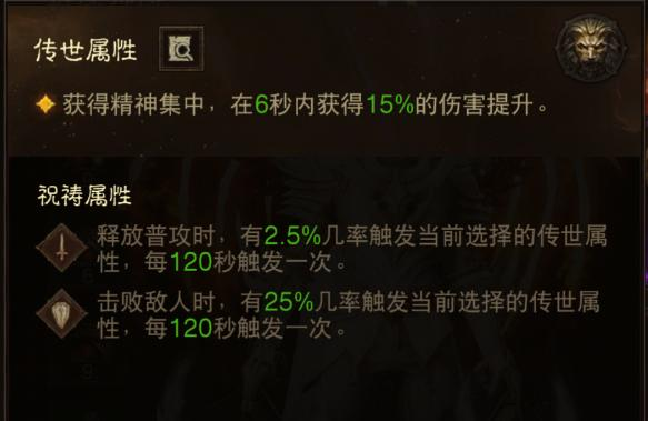 先说传世属性,进入战团据点,也就是赛兰格古堡,到达位于古堡中间的宝藏台,在宝藏台上每位成员都可以供奉一件传世武器,传世武器区别于普通装备,就是多了一个传世属性,如图所示,只有主手武器才会带有传世属性,在方框内选择自己需要的传世属性使其生效,传世属性的触发还需要祝祷属性,比如这一条释放普攻时,有2.5%的几率触发当前选择的传世属性,每120秒触发一次。