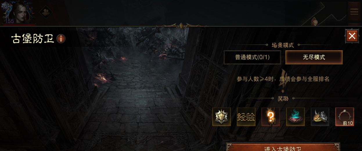 最后一个内容就是古堡防卫了,古堡防卫分为普通和无尽两种模式,两种模式的内容都很简单,玩过植物大战僵尸或者保卫萝卜的朋友应该都能了解,具体细节可以查看古堡防卫规则说明,普通模式每周只能开启一次,团长可以召集成员在任意时间开启,并不需要等到设定的时间,无尽模式开启是不限制次数的。