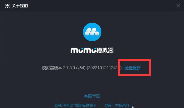 1、首先确认你的MuMu模拟器是最新版,点击模拟器右上角关于我们,检查更新。