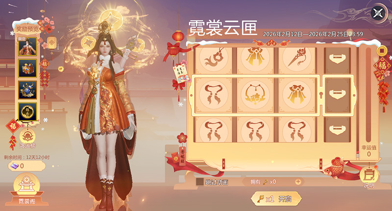 新春限定外观「金镂铜华」上线!活动期间,少侠可通过霓裳云匣获得限定自选外观·金镂铜华,开启后即可自选限定外观「金镂铜华」、「玉骨冰姿」、「石火焰身」或「鸩羽幽梦」、「金阙仙」其中之一;同时,云匣商店可兑换岁华葫芦、潜龙锥、灵息玉等奖励。