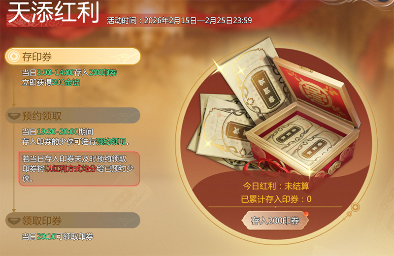 少侠每日8:00-14:00期间,在【馈礼】-【华章馈礼】-【天添红利】处存入印券,立得海量金锭!存入当天晚上19:30-20:00期间,还可预约取回印券,预约成功后,20:10分将返还当天存入印券并可参与瓜分本日本服未预约领取的少侠所存印券!