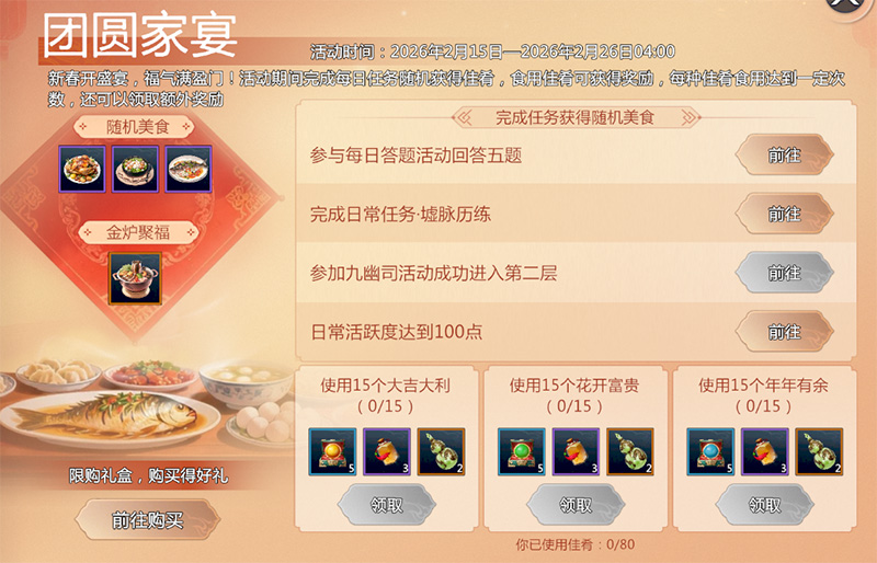 活动期间,每日完成指定任务可以获得【佳肴】,食用佳肴有机会获得聚灵葫芦、天机秘宝、灵息玉等奖励。每种佳肴食用达到15次,还可以领取额外奖励。