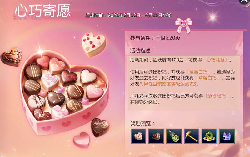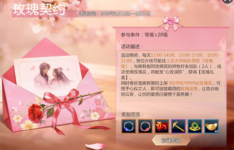 订玫瑰契约,许海誓山盟!情人节系列活动将于2月12日(更新后)开启,参与活动,有机会获得情人节限定称号、聚灵葫芦等甜蜜好礼,更可“大秀恩爱”,让全服共同见证侠侣情缘!
