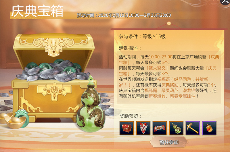 活动期间,每日10:00-23:00上京广场、「篝火聚义」期间的帮会地图刷新大量「庆典宝箱」,世界频道发送指定祝福语还有概率获得庆典奖励,参与活动,有机会获得新春外观挂件、新春烟花、潜龙锥、聚灵葫芦等好礼。